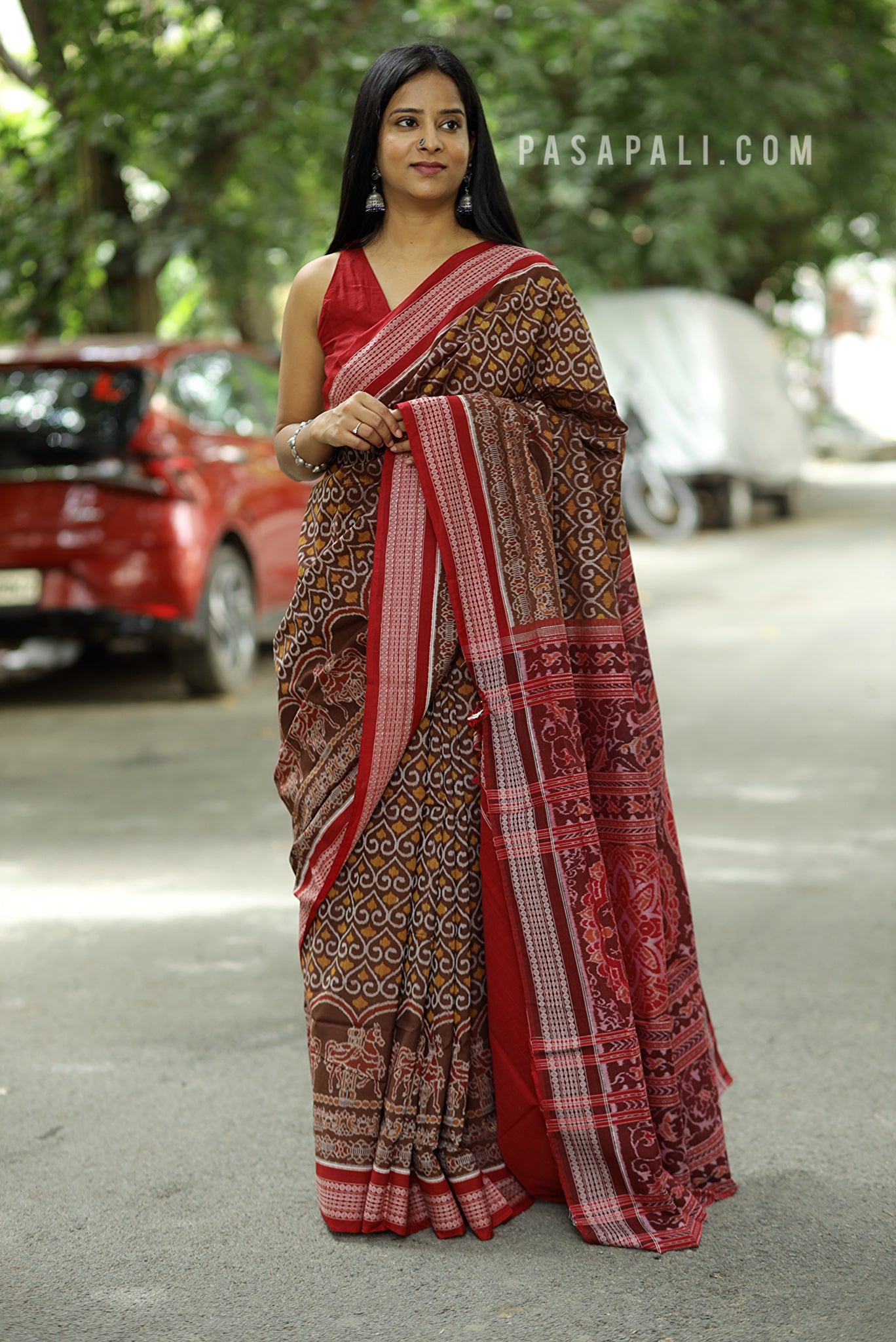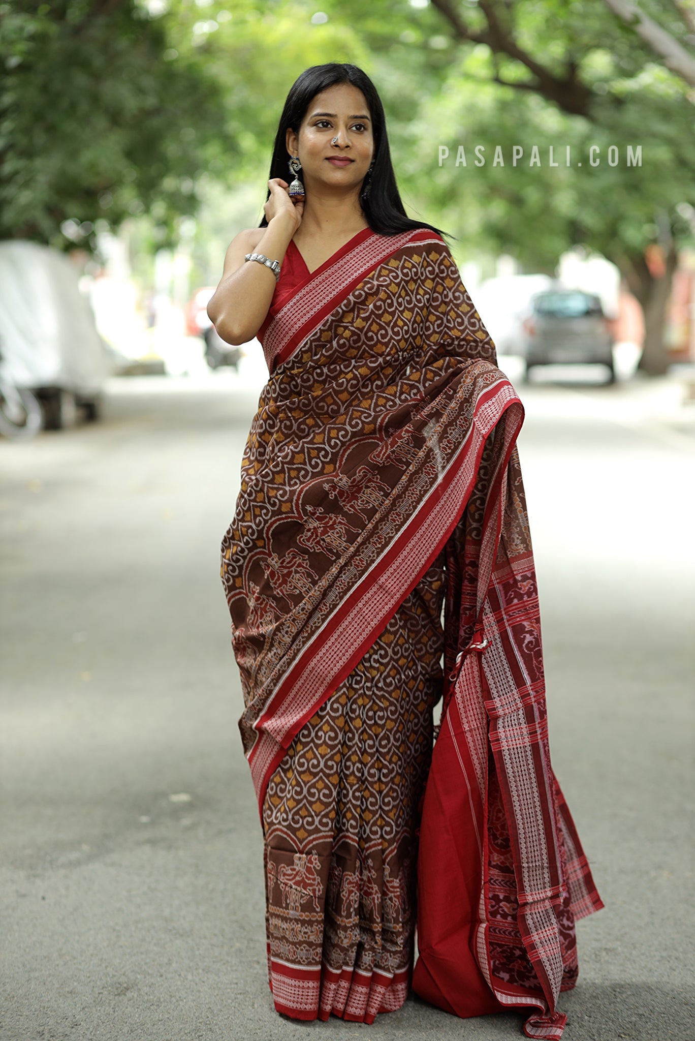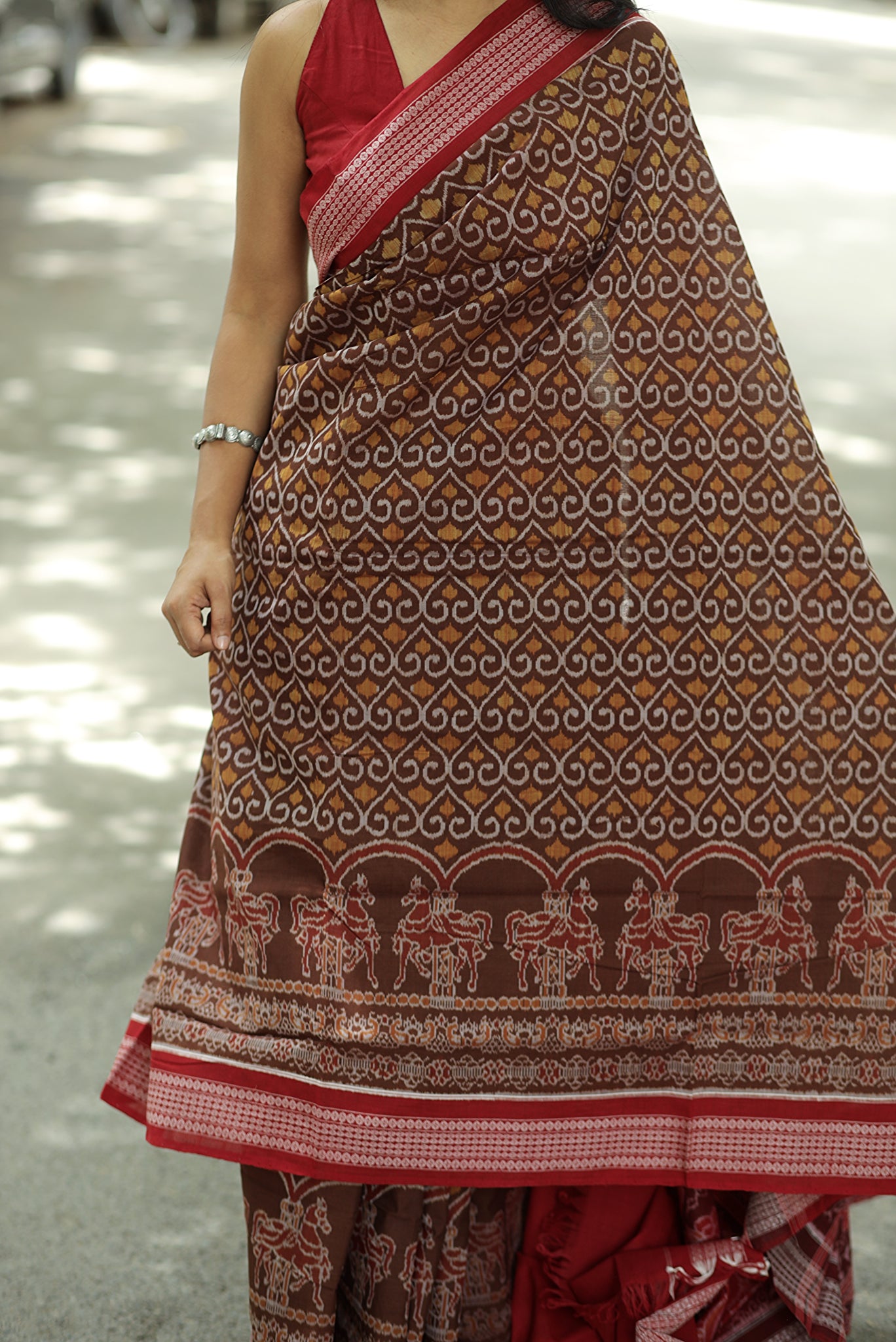 Celebrate Odisha’s rich textile heritage with this brown Sambalpuri Ashwa Bandha saree by Pasapali, a masterpiece that merges tradition with elegance. The highlight of this saree is its row of intricately woven horses at the lower body—standing gracefully, symbolizing strength, prosperity, and royal heritage. Known as the classic Ashwa Bandha motif, this design is one of the most revered in Sambalpuri weaving.