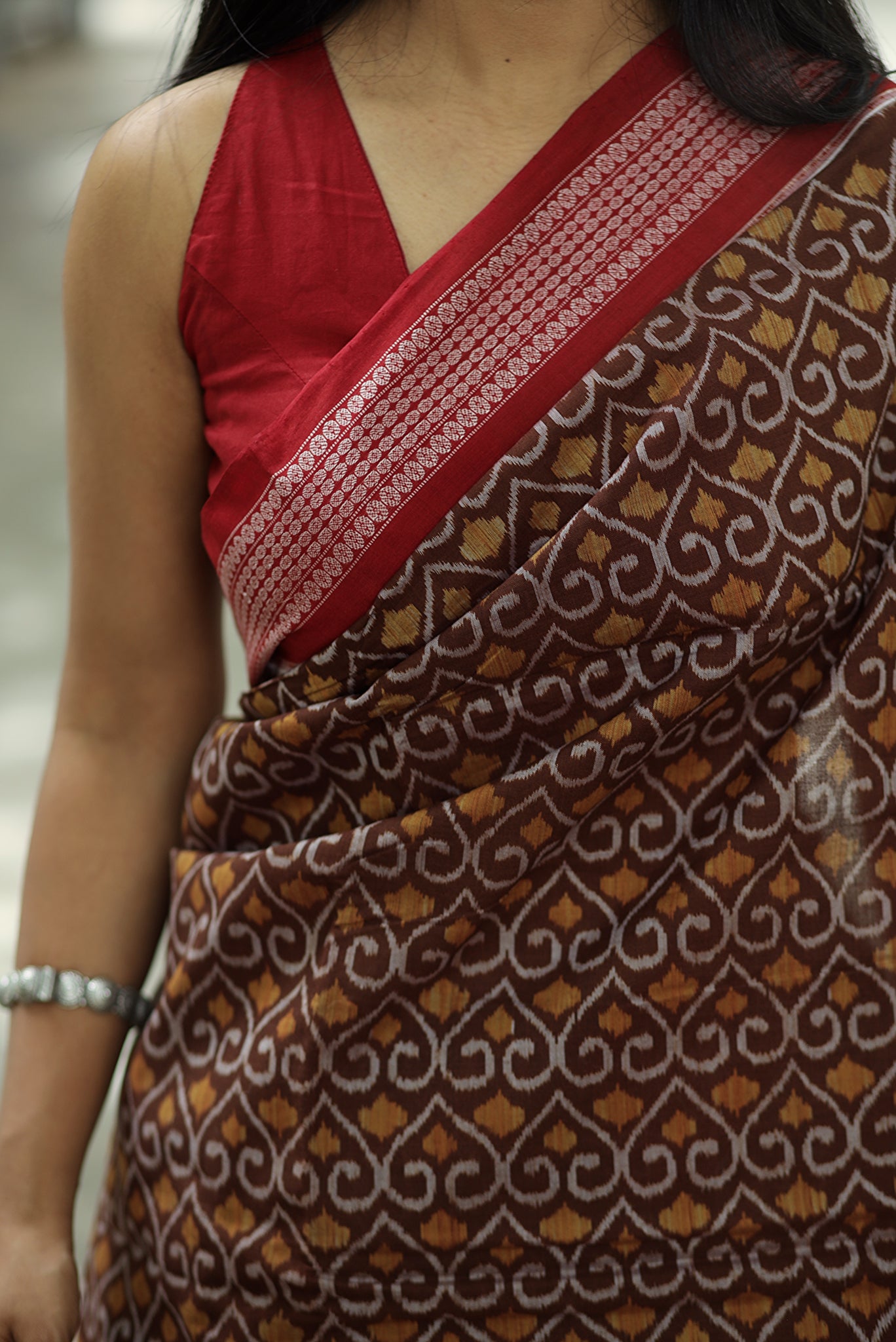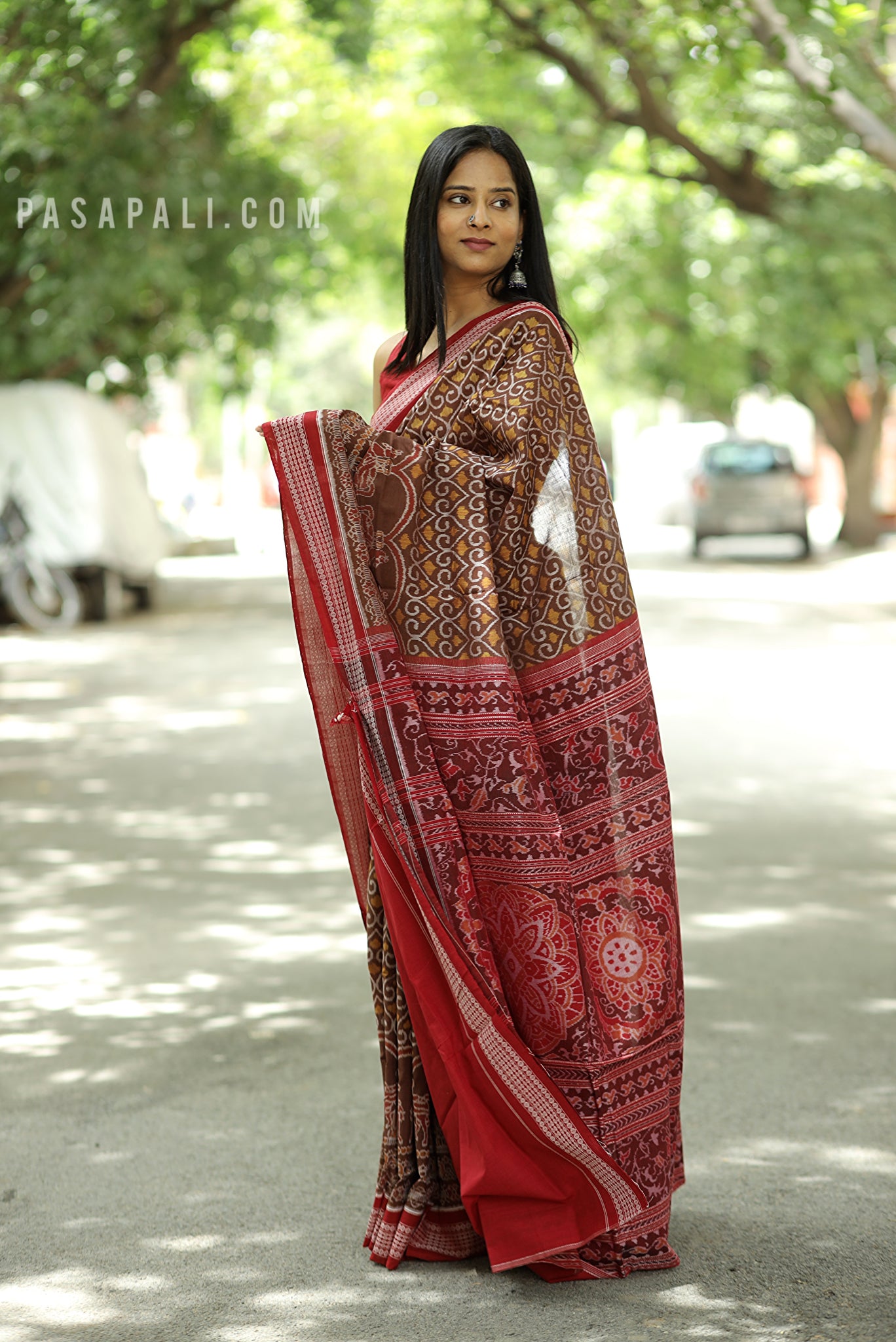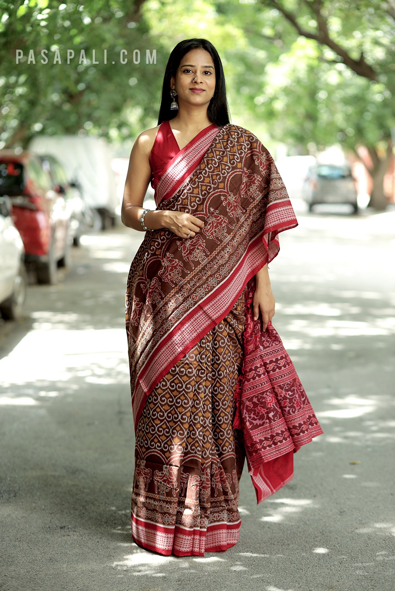 Celebrate Odisha’s rich textile heritage with this brown Sambalpuri Ashwa Bandha saree by Pasapali, a masterpiece that merges tradition with elegance. The highlight of this saree is its row of intricately woven horses at the lower body—standing gracefully, symbolizing strength, prosperity, and royal heritage. Known as the classic Ashwa Bandha motif, this design is one of the most revered in Sambalpuri weaving.