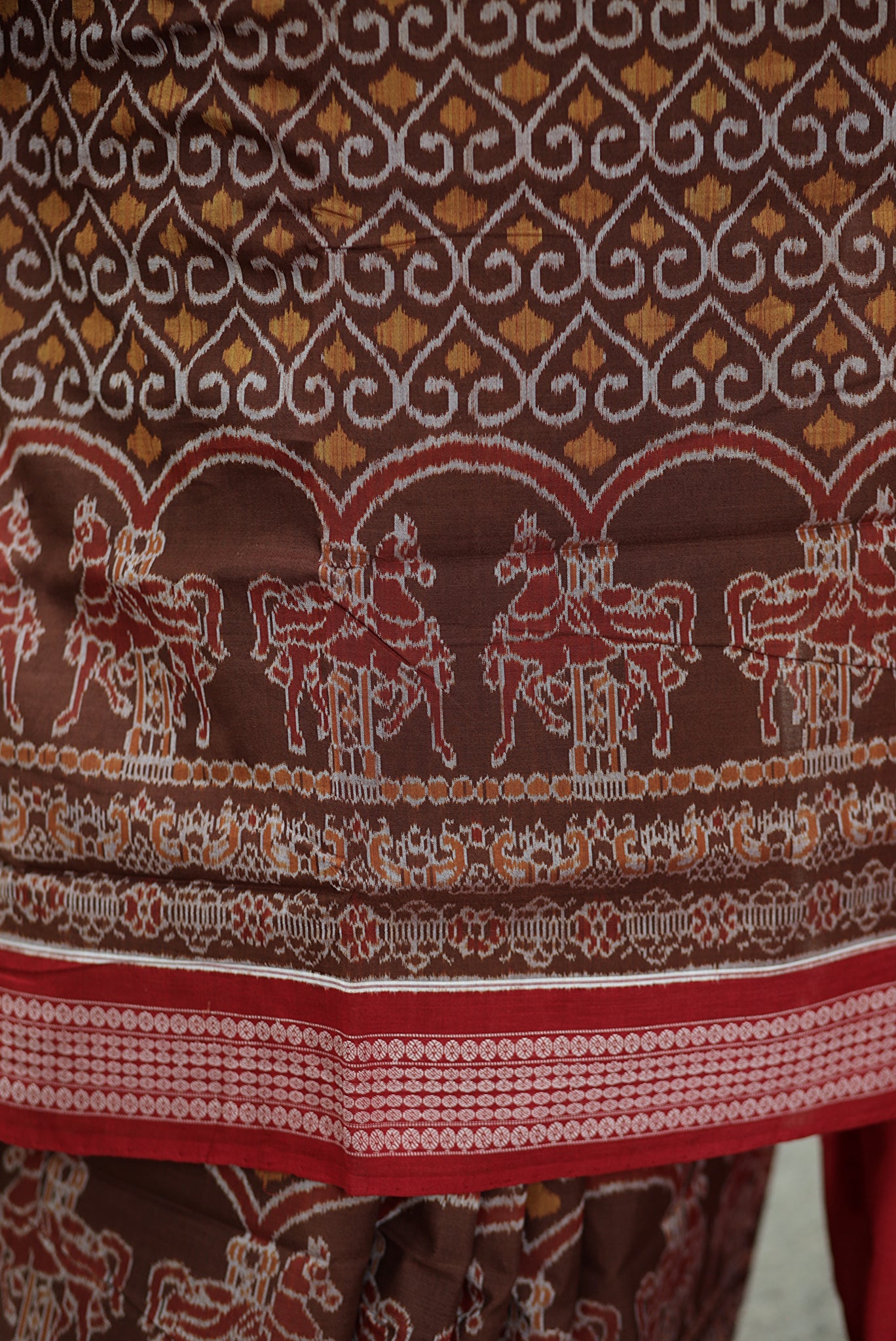 | Key Craftsmanship | Ashwa Bandha horses at lower body, Phool/Jala floral-geometric Ikat pattern on upper body, intricate flower motifs on pallu |