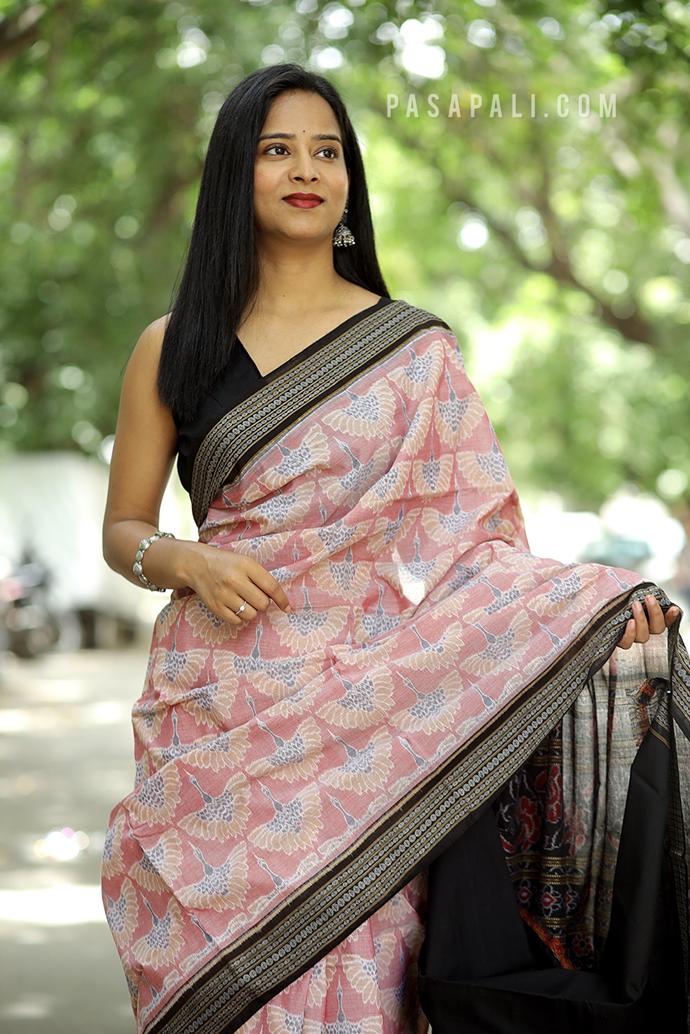 Introducing Baang Basanti, a graceful mercerized cotton Sambalpuri saree crafted with timeless artistry by skilled weavers of Odisha. This exquisite piece celebrates one of the region’s most cherished motifs—the Baang bird, depicted in a beautiful crane-like flying posture across the soft light reddish pastel body. Each motif is meticulously tied and dyed through the traditional Bandha (Ikat) technique, making every saree a unique expression of heritage craftsmanship.