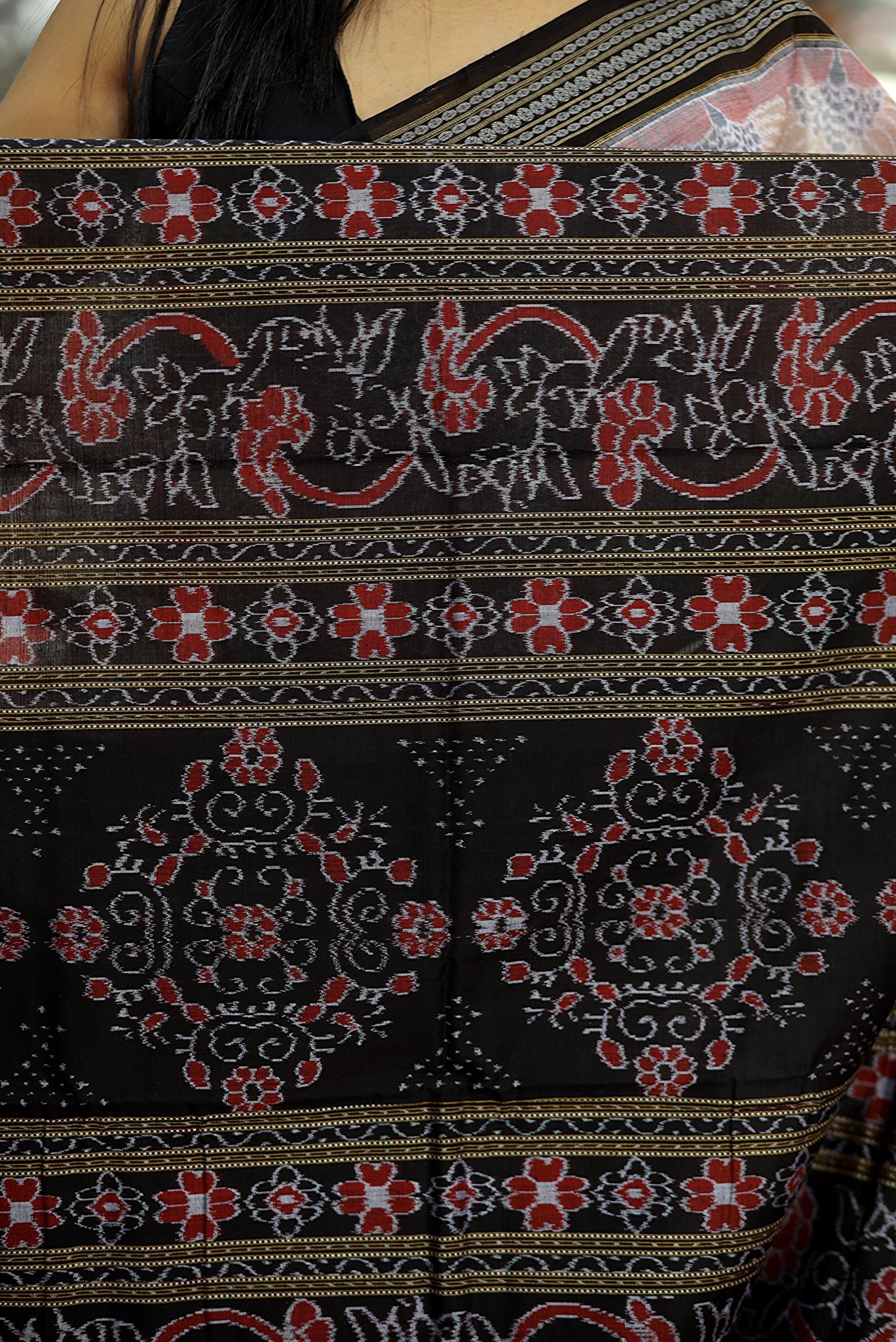 The striking black Rudraksha border adds depth and contrast, symbolizing protection and auspicious energy—an iconic detail beloved in Sambalpuri sarees. The black pallu further elevates the look with mesmerizing red and black flower motifs and classic jhuti patterns, all created using precision Ikat weaving.