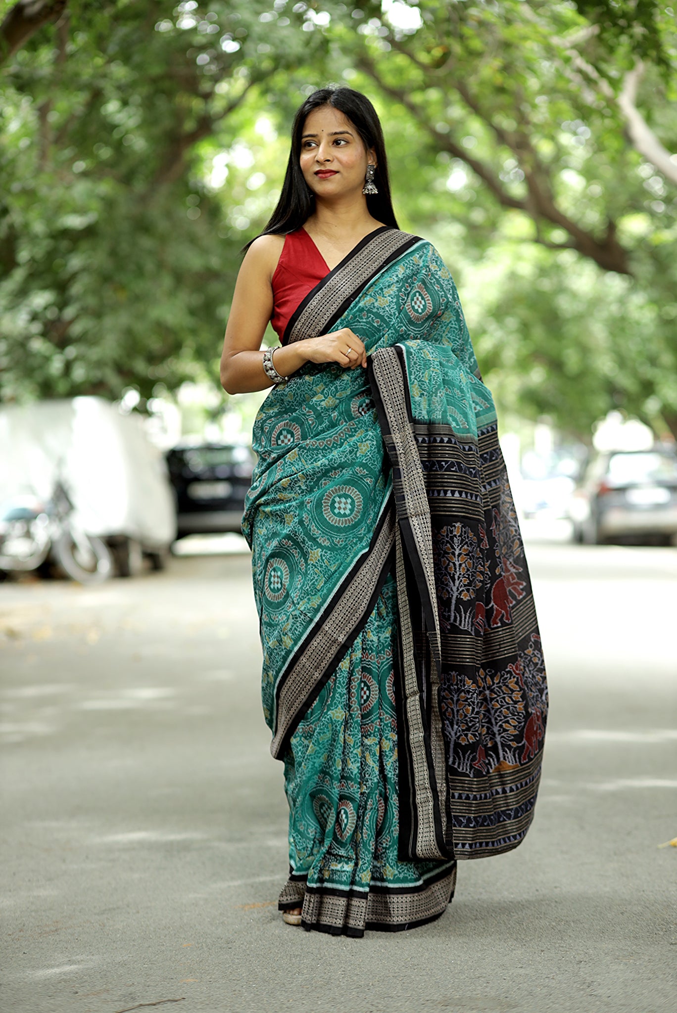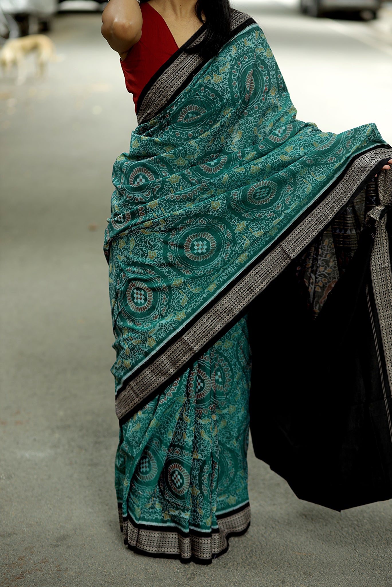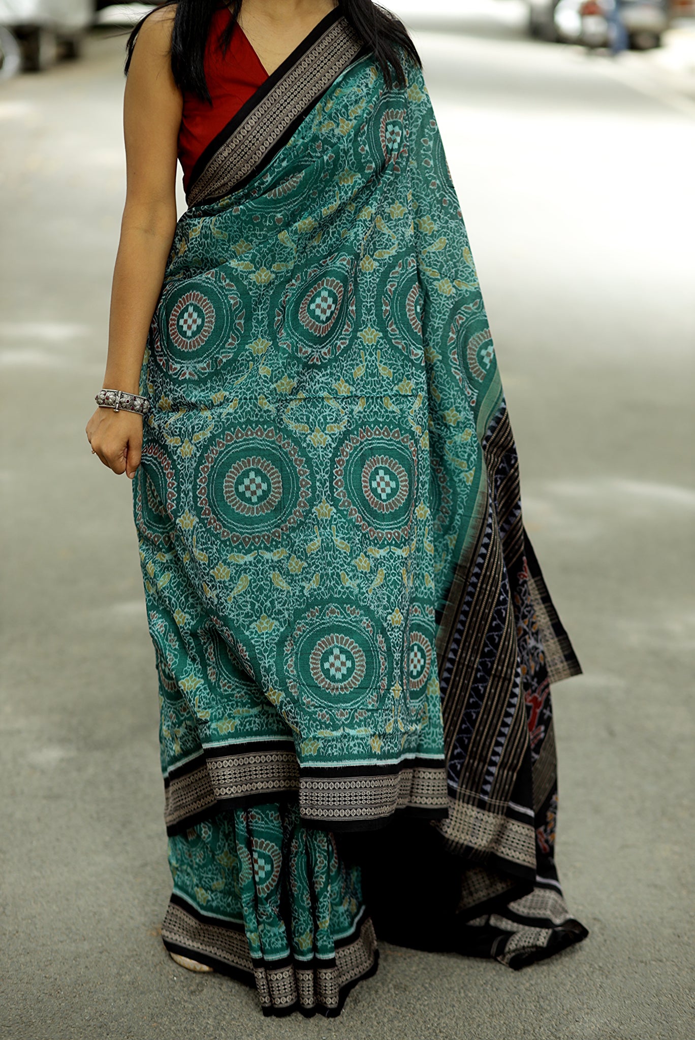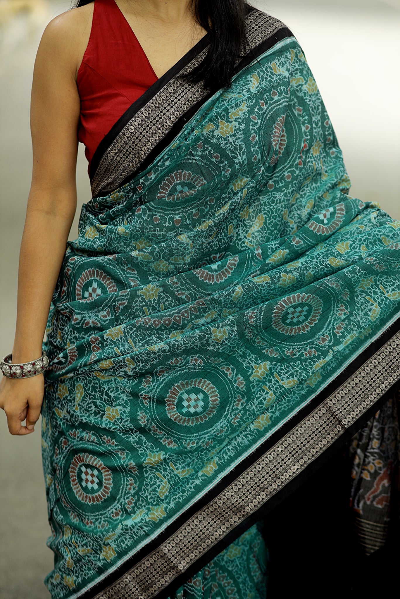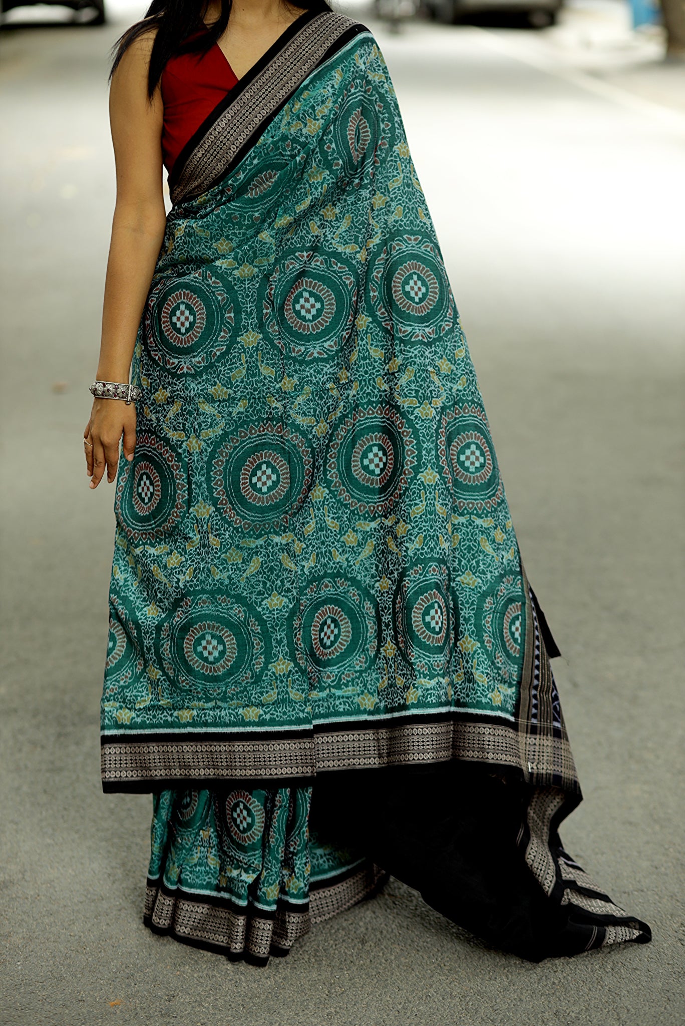 Introducing Chakrini – The Forest Tale Saree by Pasapali, an exquisite Sambalpuri mercerized cotton saree that celebrates the timeless artistry of Odisha’s iconic Bandha (Ikat) weaving tradition. Draped in a rich, earthy green, this saree features the classic Chakra/Mandala Phula motifs, symbolising harmony and completeness—each one precisely resist-dyed by skilled Sambalpuri weavers.