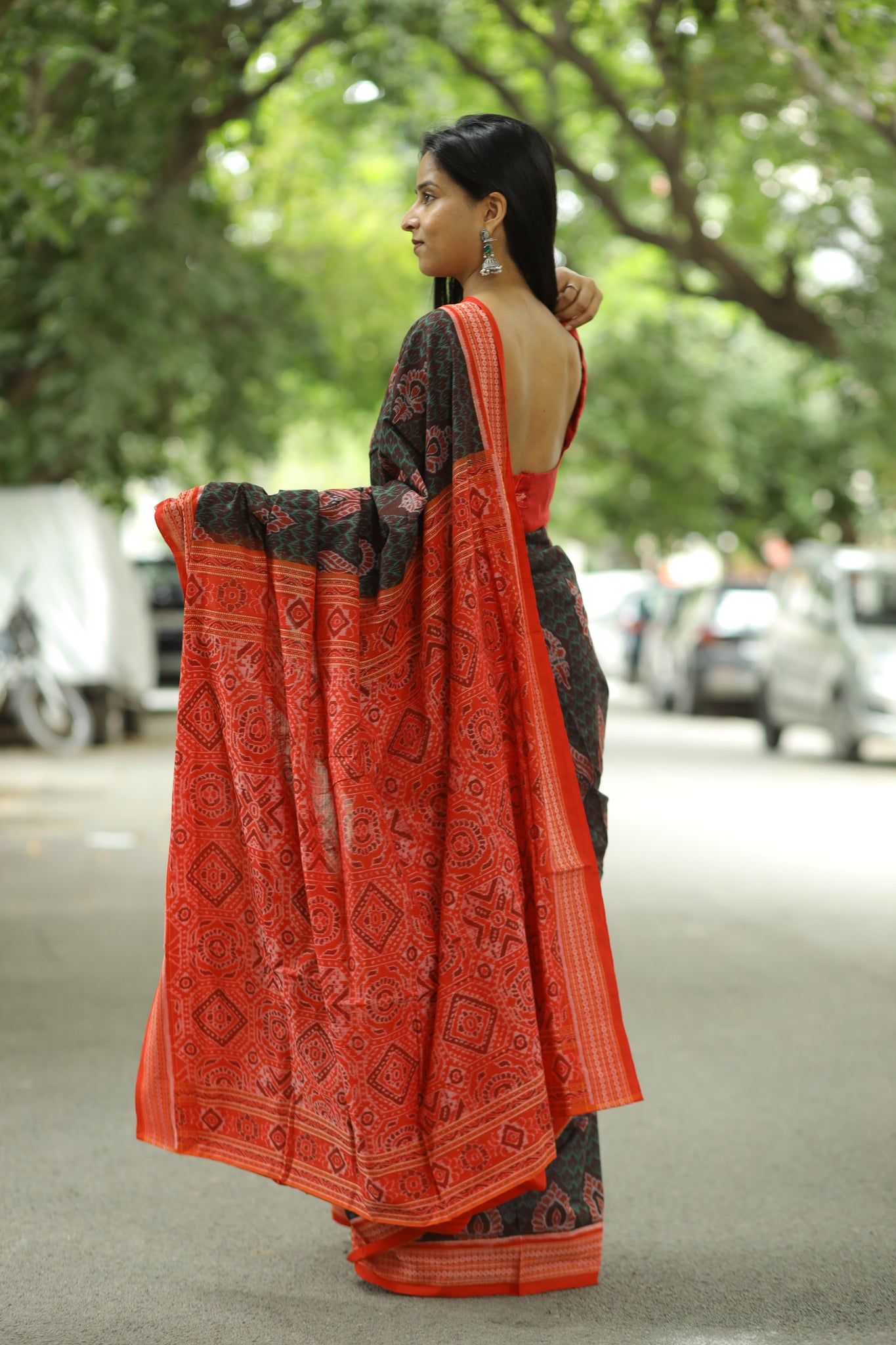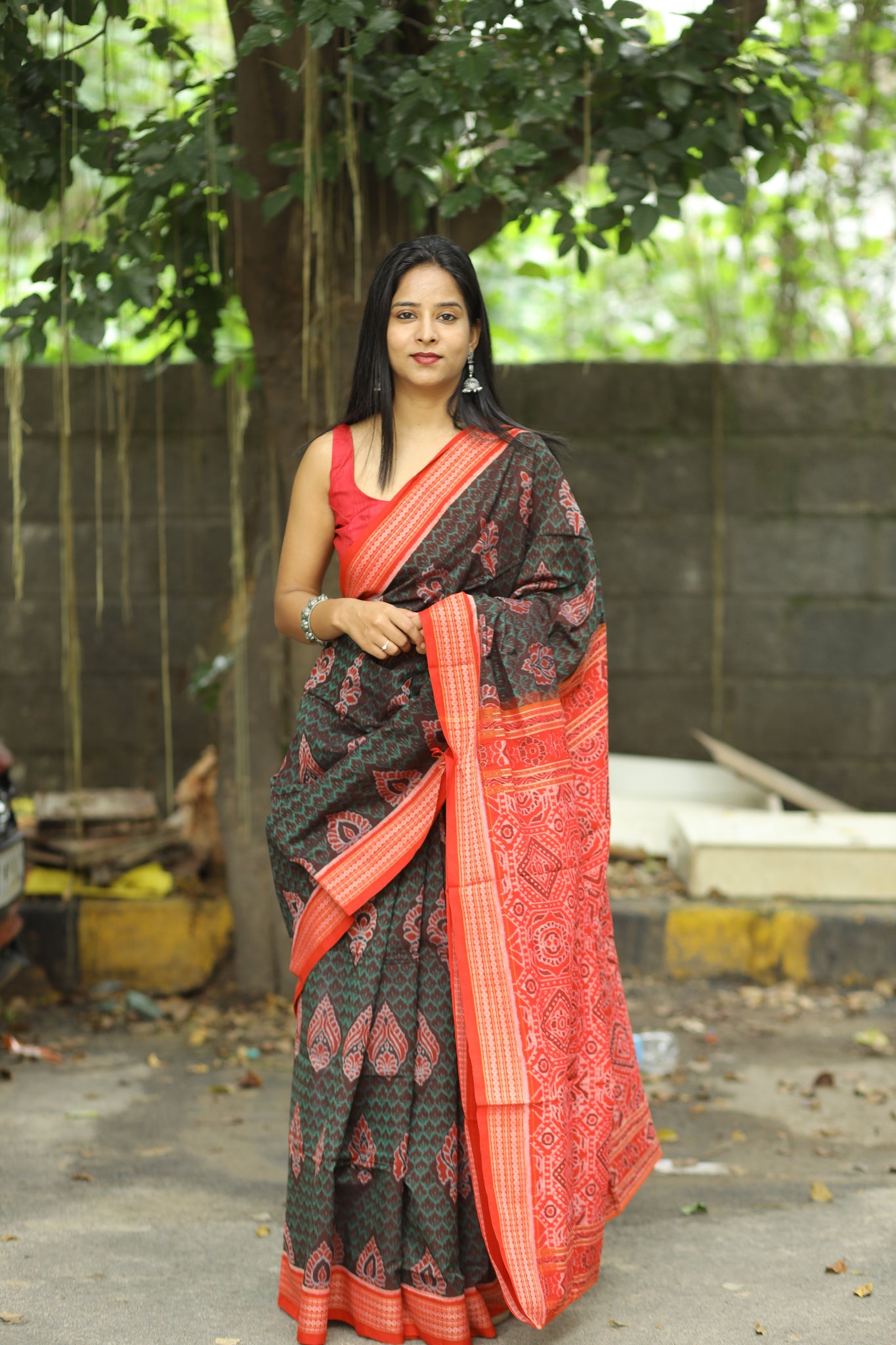 Celebrate the timeless artistry of Odisha with this Mercerized Cotton Sambalpuri Saree from Pasapali, handwoven with exquisite craftsmanship. This masterpiece features a deep dark brown base adorned with green floral bud motifs, delicately highlighted with red flower accents, symbolizing prosperity and grace. The red border embellished with the iconic Rudraksha motif enhances its traditional charm, while the pallu showcases intricate Ikat patterns—a hallmark of Sambalpuri weaving heritage.