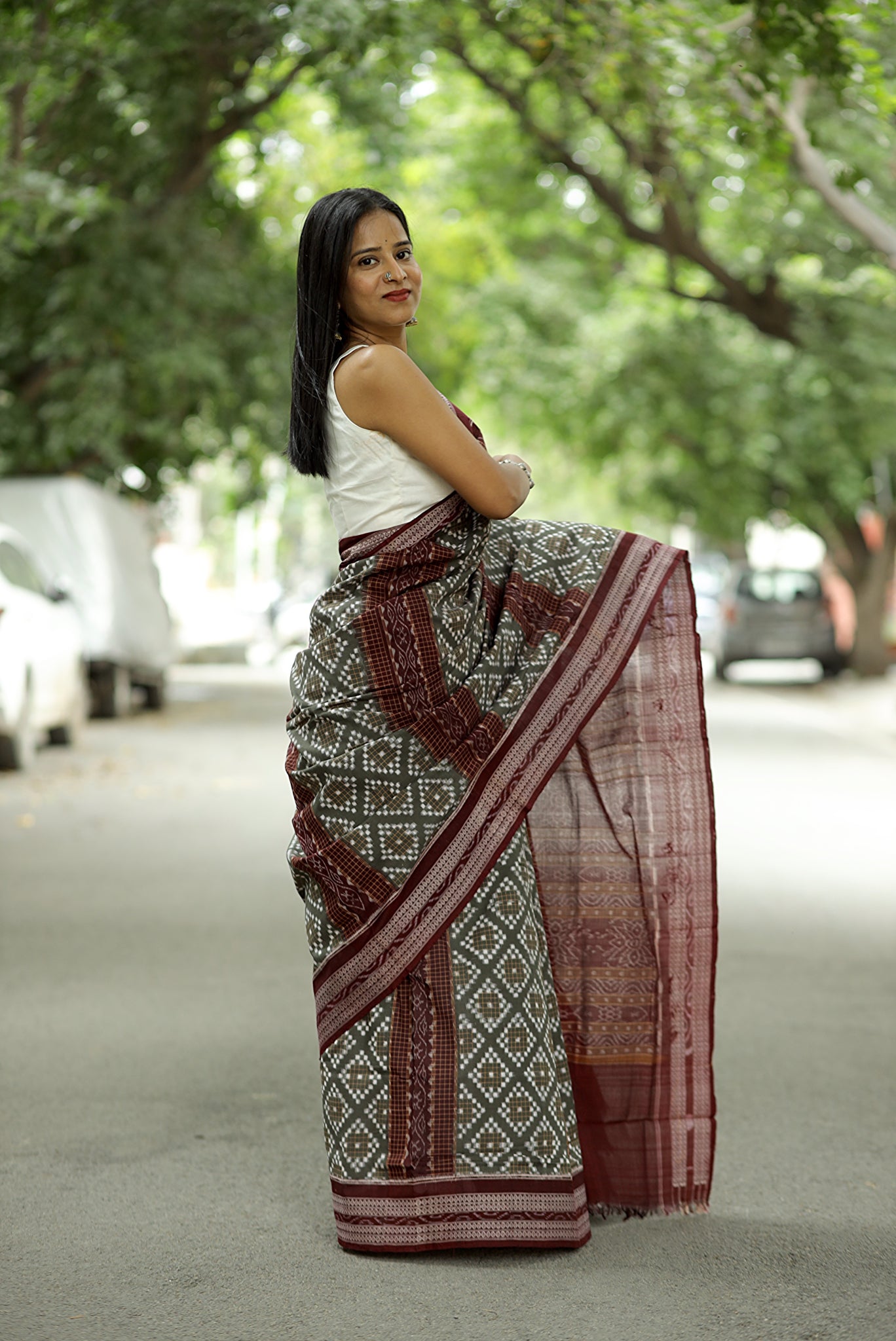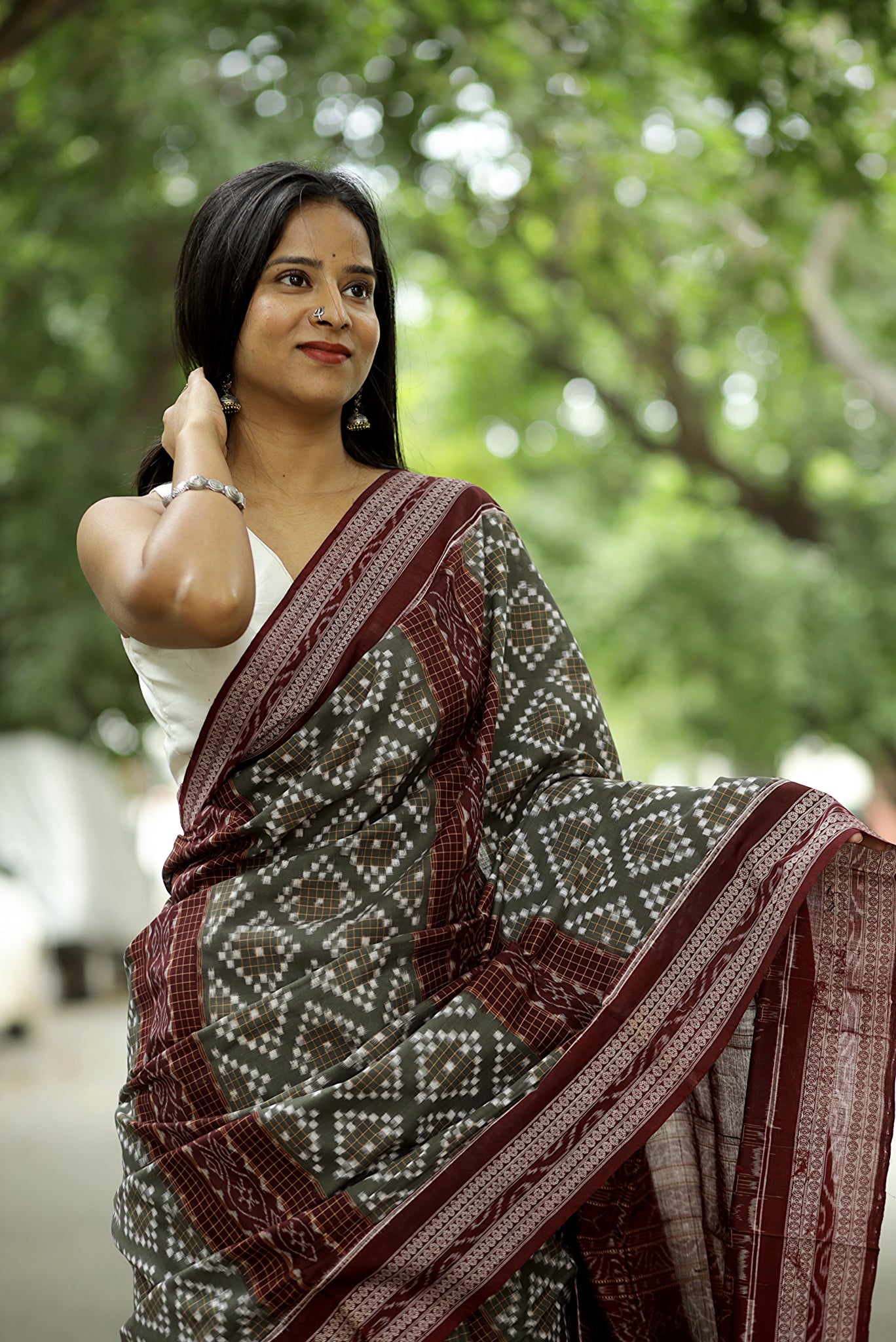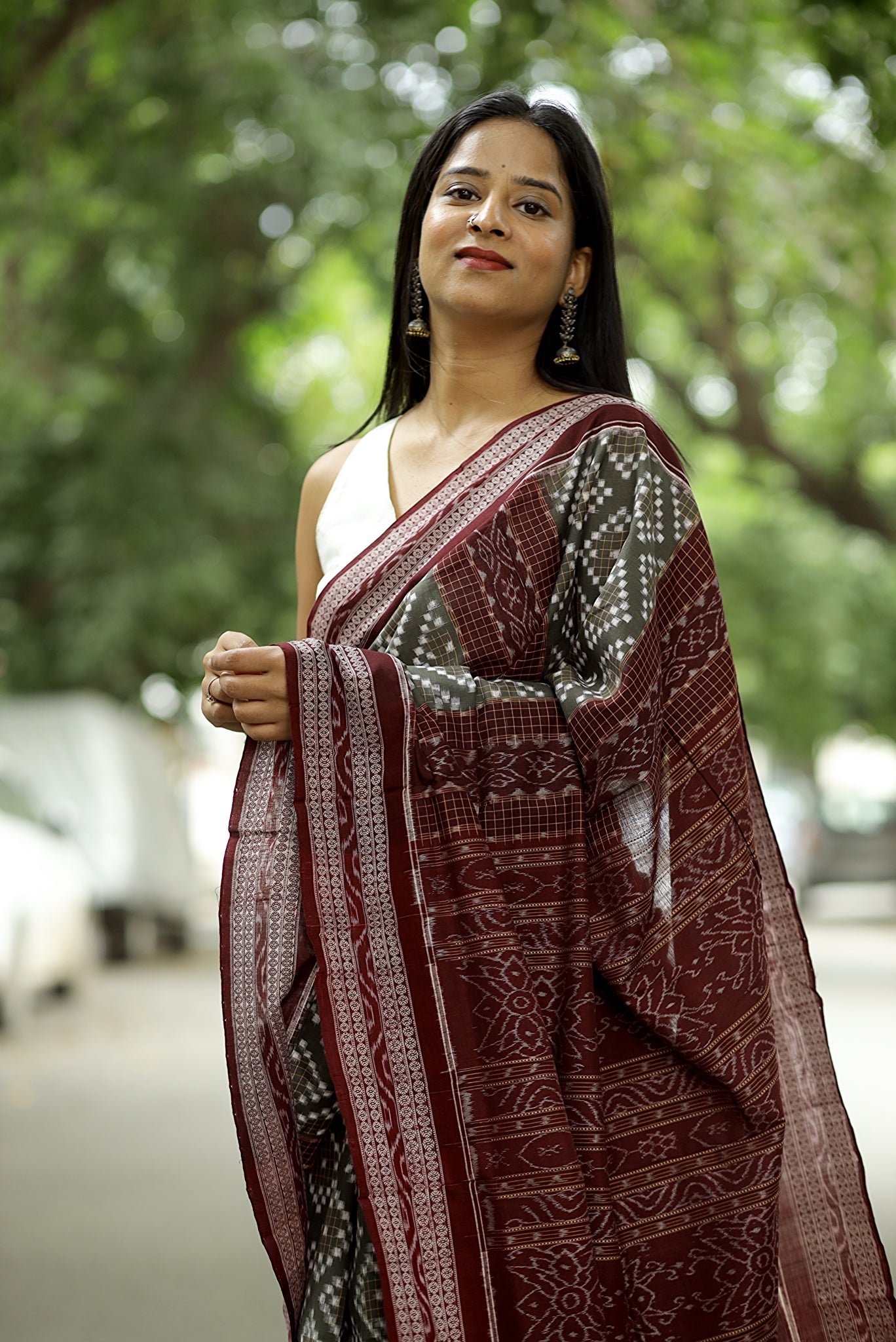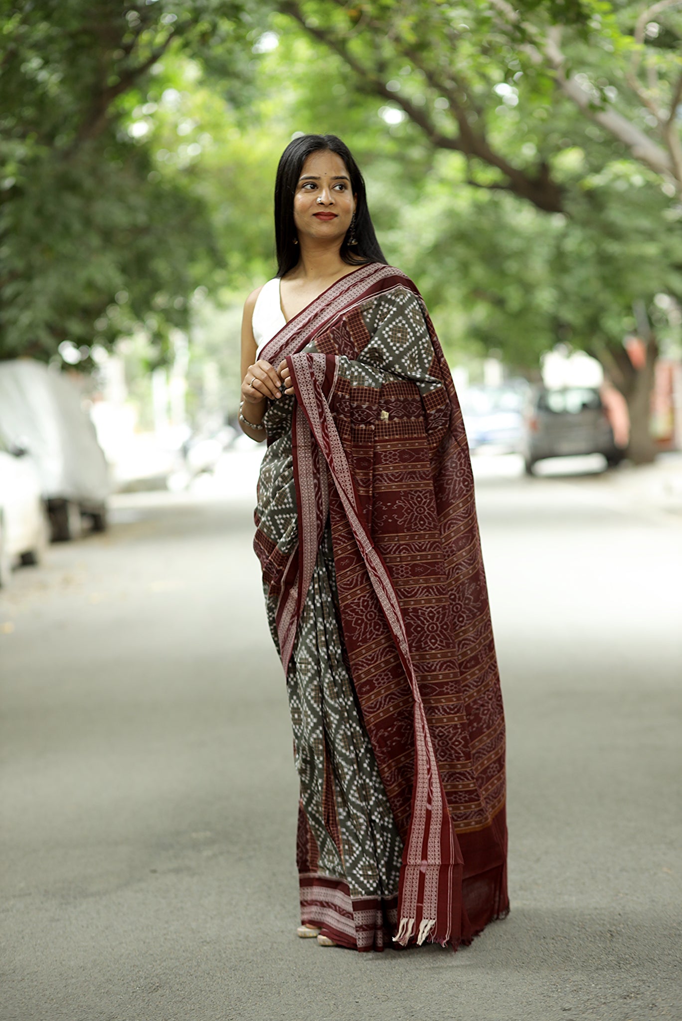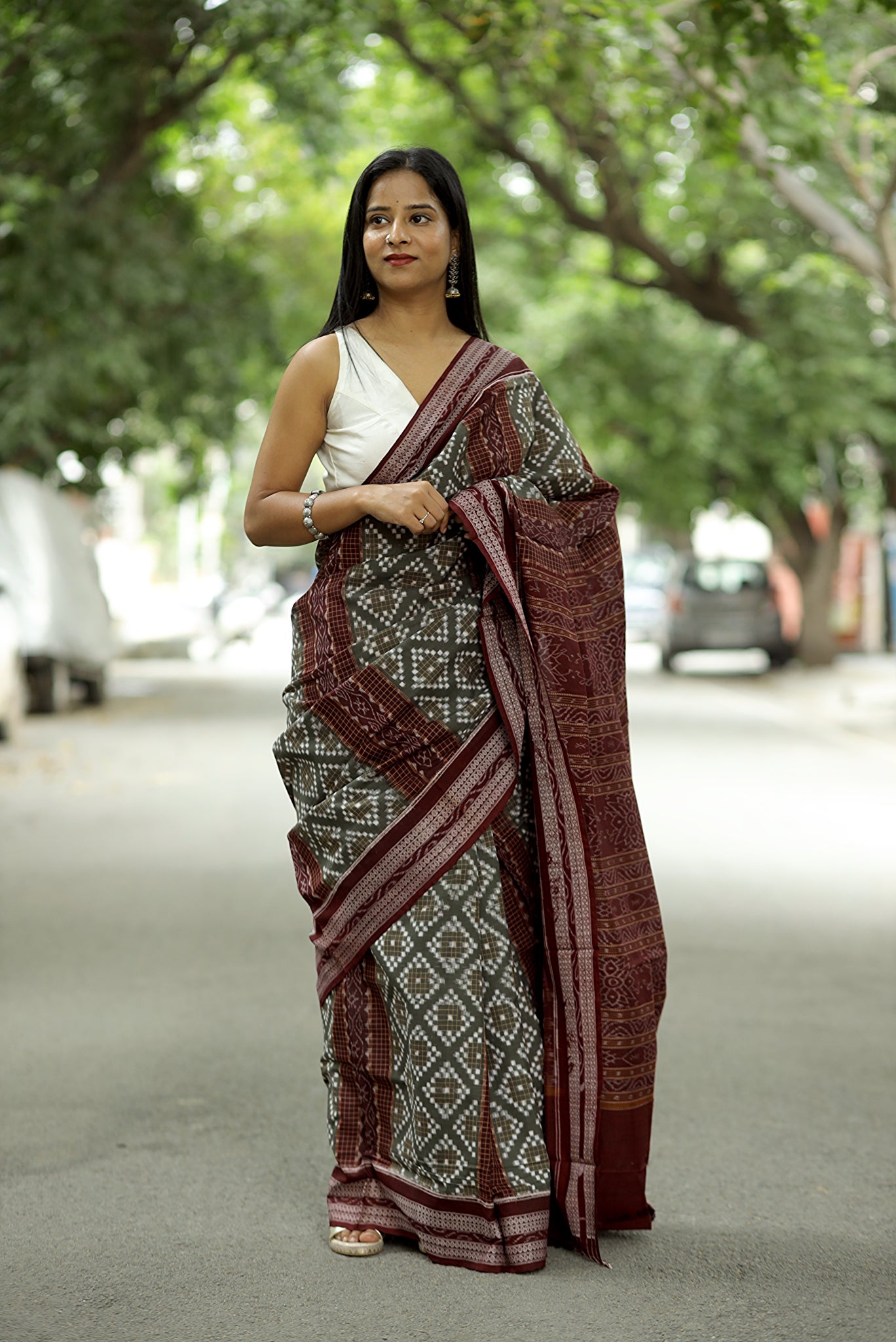 Jewelry: Pair with silver jewelry or oxidized metal pieces, which enhance the cool grey tone and complement the maroon border details.