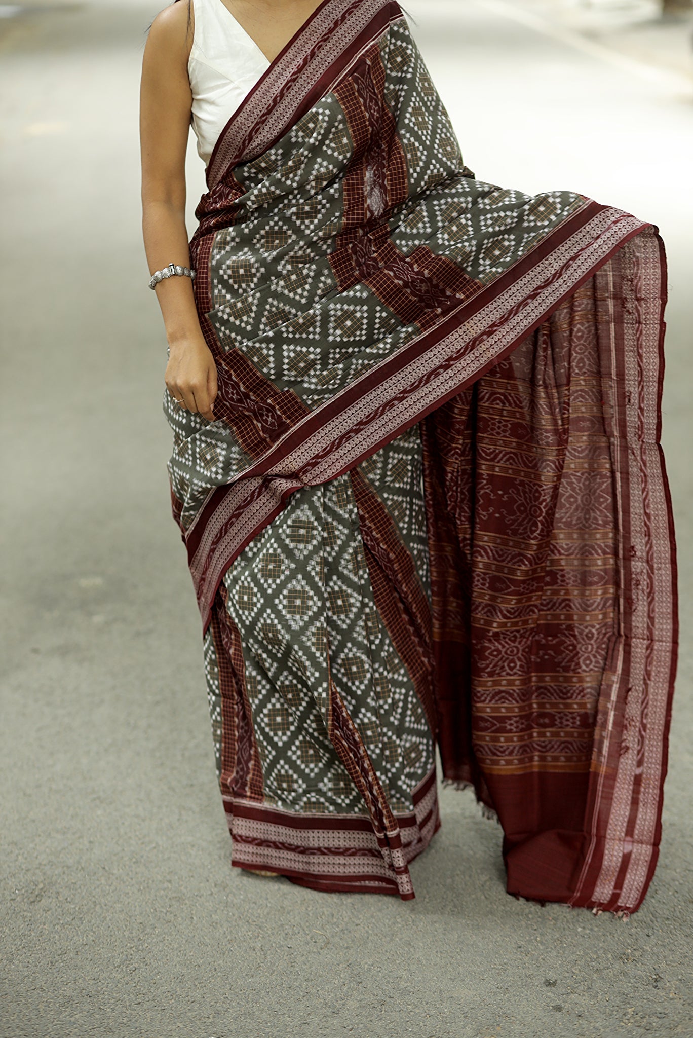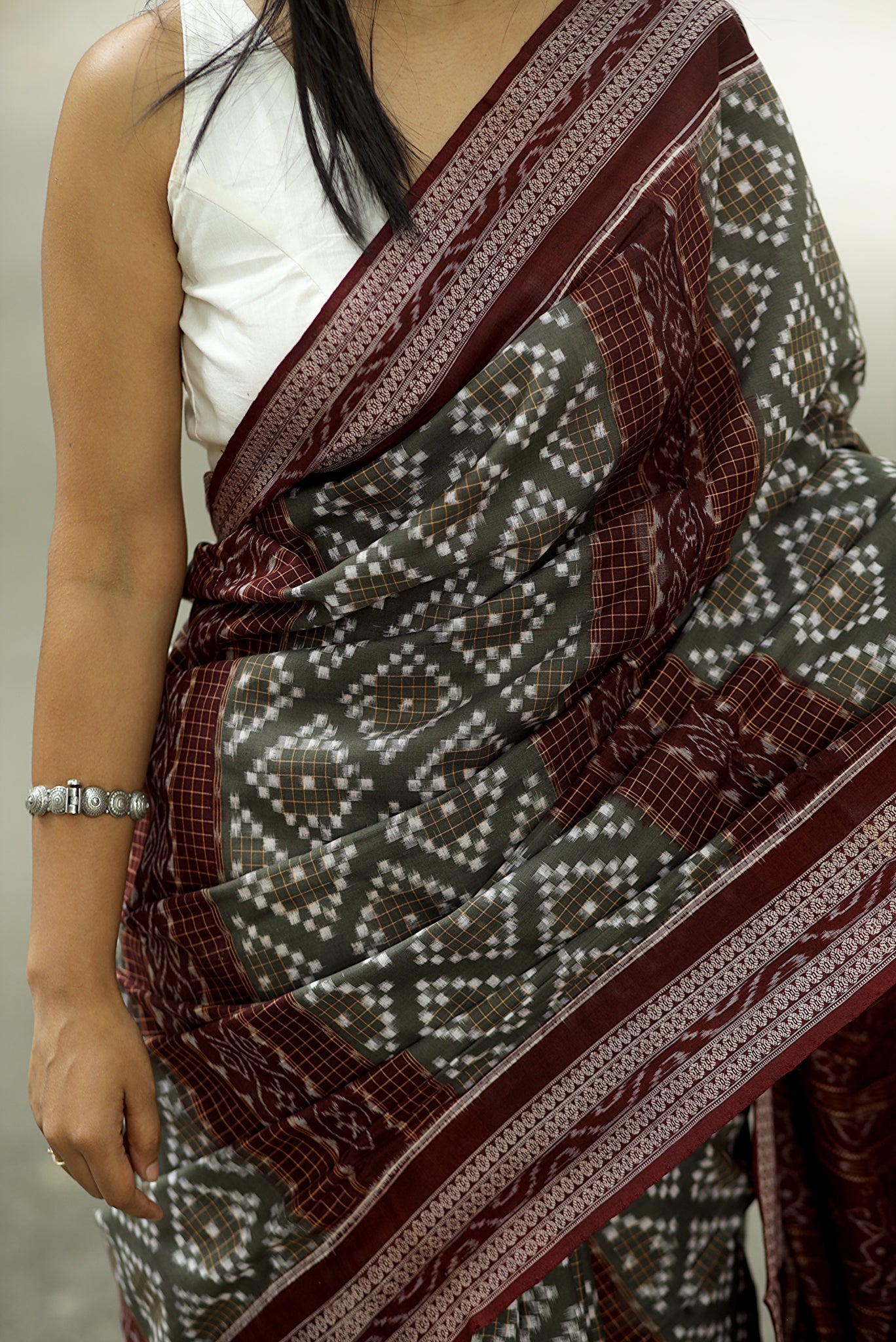 | Product Name | Grey Mini Pasapalli Maroon Rudraksha Sambalpuri Saree |