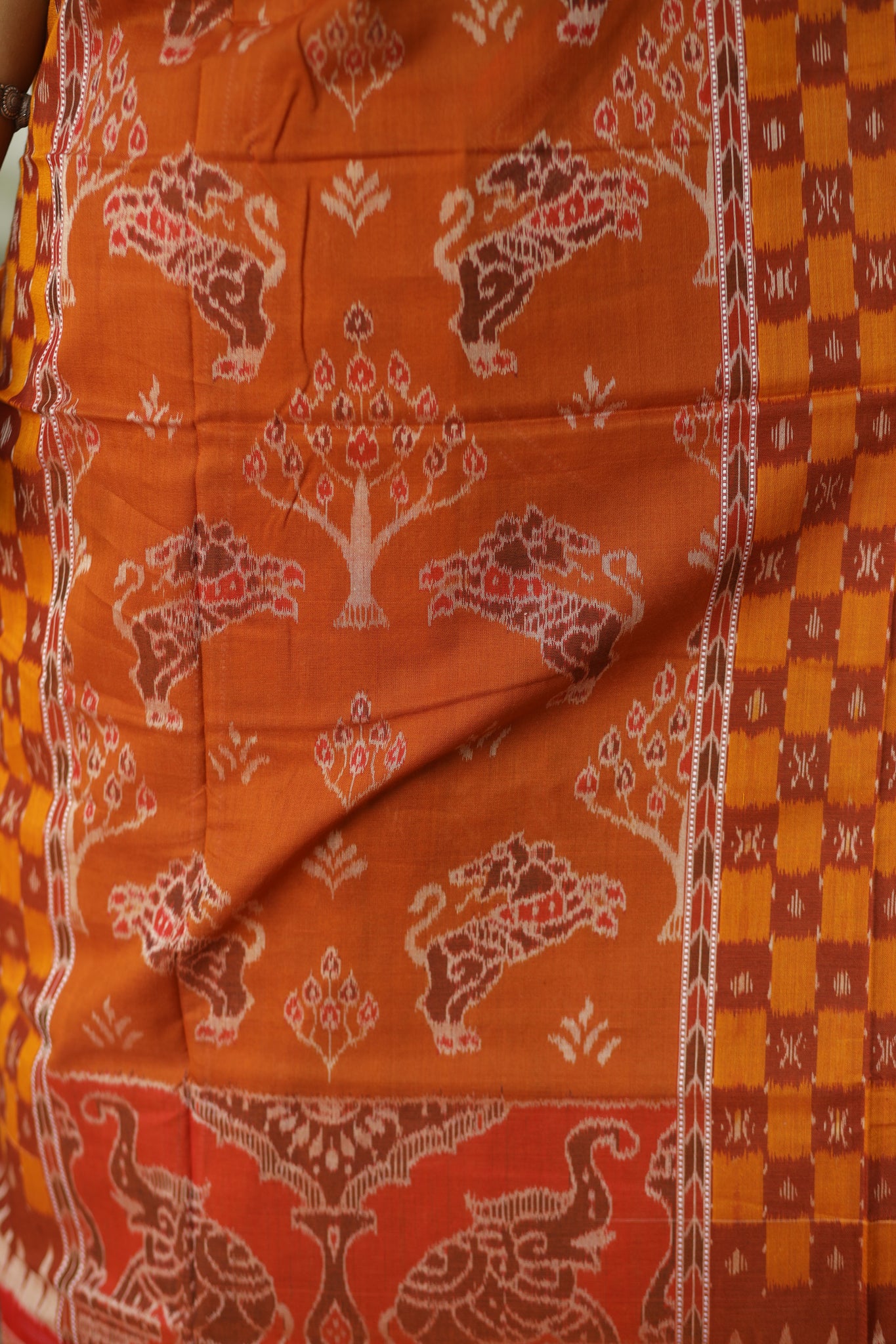 Discover the timeless allure of Sambalpuri sarees with Urmiweaves. Our light brown Sambalpuri cotton saree is a masterpiece of artistry, featuring intricately handwoven elephant and lion ikat motifs. These motifs symbolize power and patience, making this saree a symbol of strength and grace.