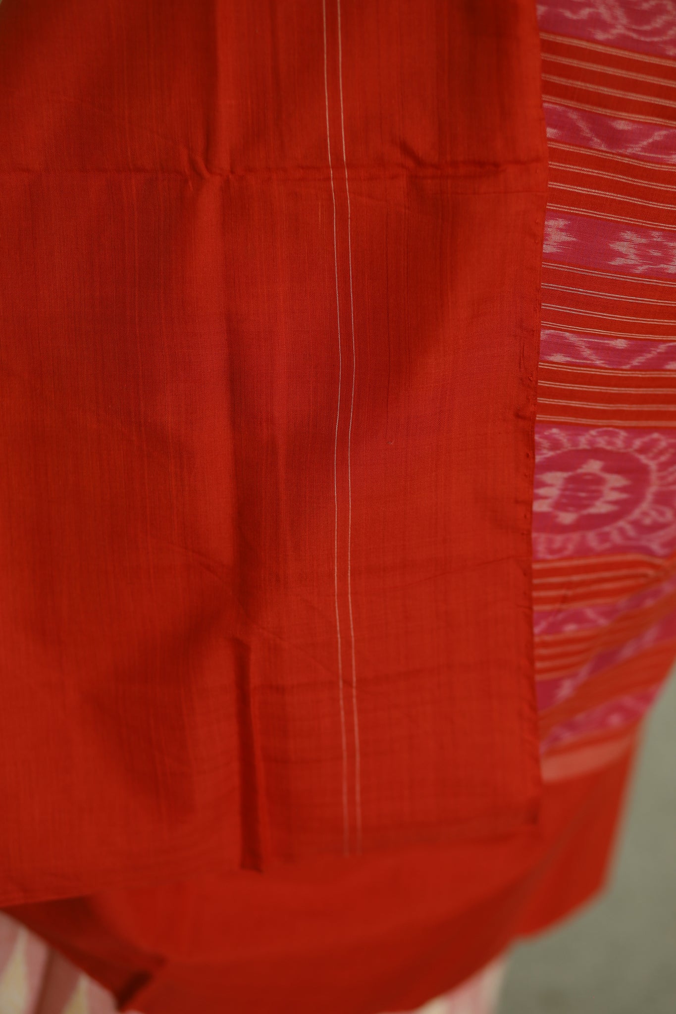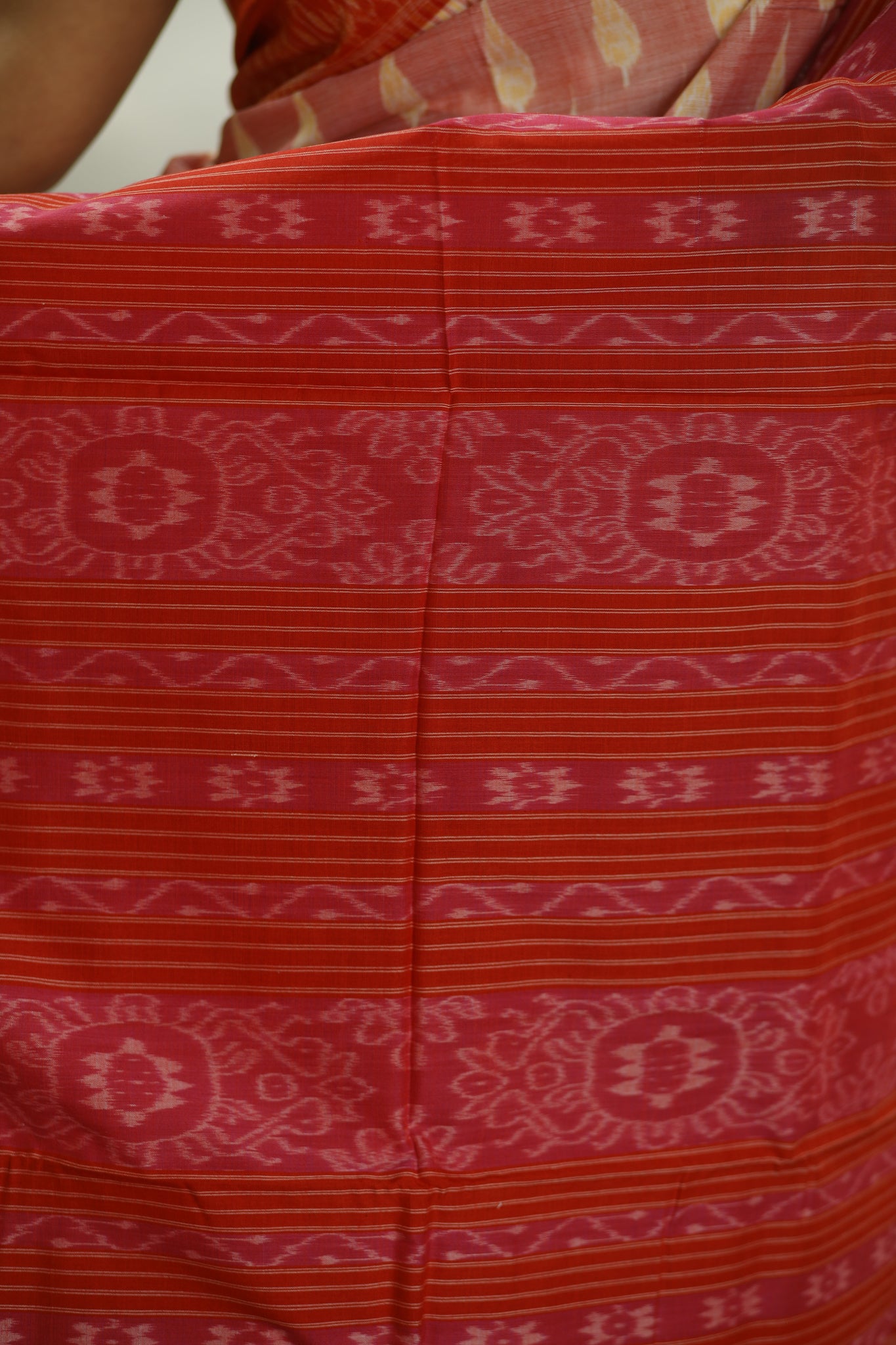 Each thread of this artisan-crafted masterpiece tells a story. Meticulously handwoven by skilled artisans using traditional Ikat-dyed techniques, the Orange White Sambalpuri Cotton Saree showcases intricate leaf design motifs gracefully flowing across its serene body. The vibrant orange-red border, adorned with classic Ikat patterns, creates a stunning contrast, while the pallu boasts a mesmerizing display of orange-red floral Ikat patterns, enhancing its allure and charm. Feel the superior comfort and durability of pure Sambalpuri cotton, a testament to the natural dyes and meticulous attention to detail. This luxury Sambalpuri saree is perfect for festive occasions, grand celebrations, or as a distinguished addition to your collection of designer Sambalpuri wear.