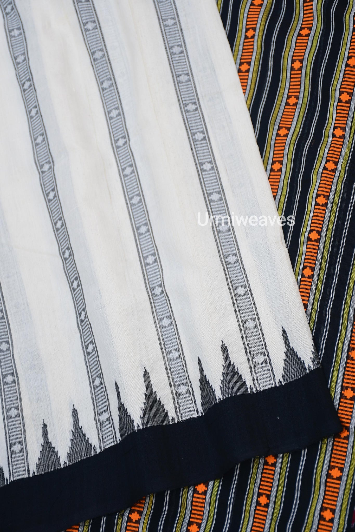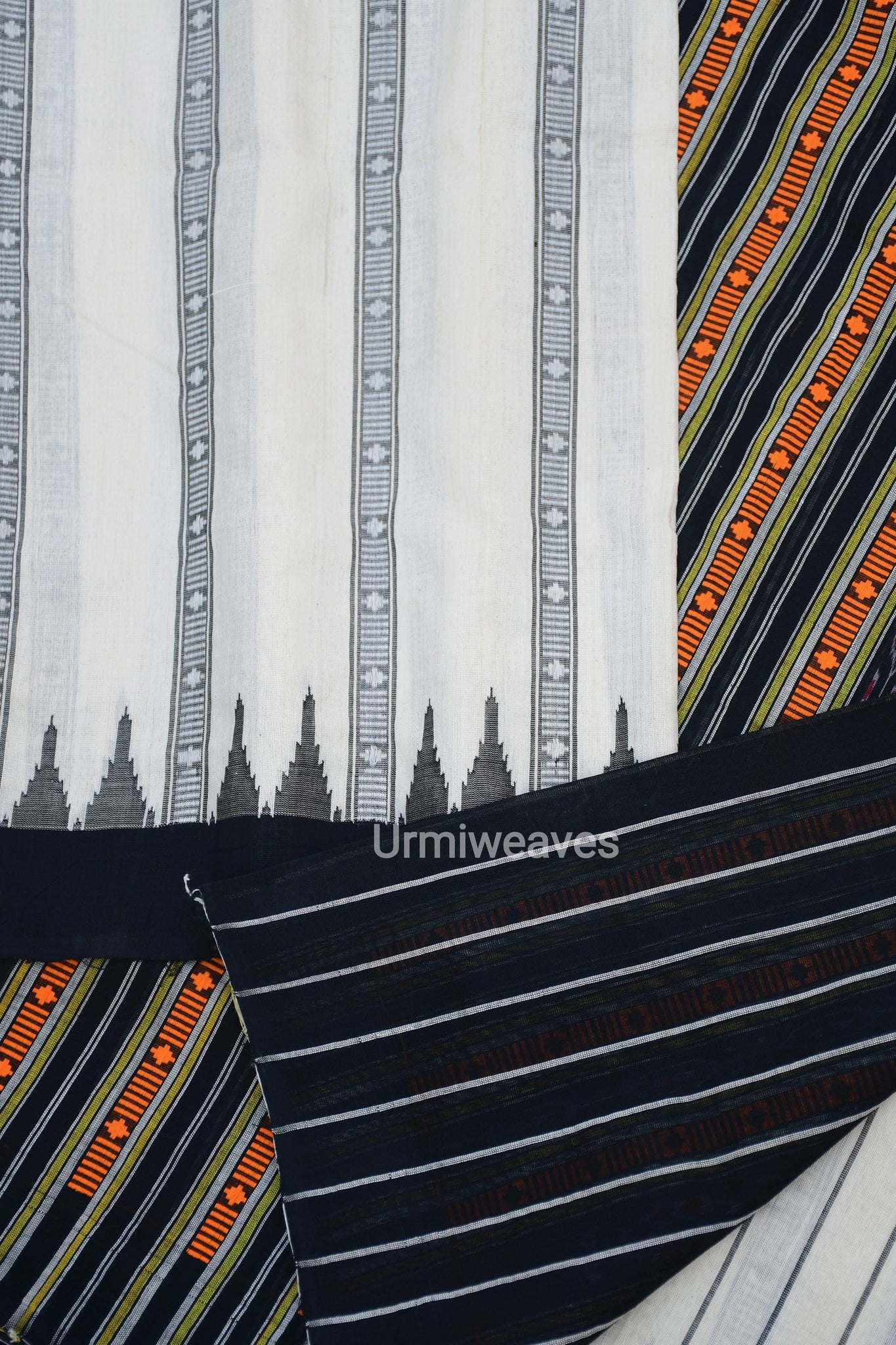 Get ready to make a statement with our stunning white high-density Khadi Phoda Kumbh saree! This exquisite masterpiece features a unique diamond lining thread work delicately woven onto the body, creating a mesmerizing visual effect. The saree is elegantly complemented by a contrasting black border, adorned with intricate thread work that adds a touch of sophistication.