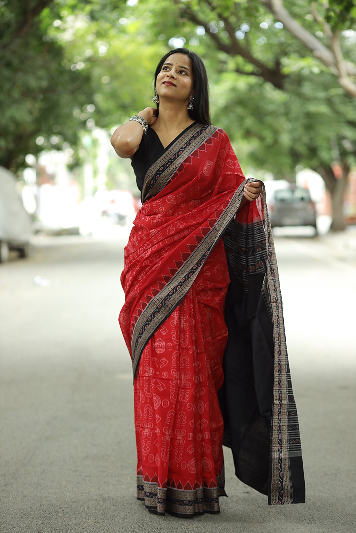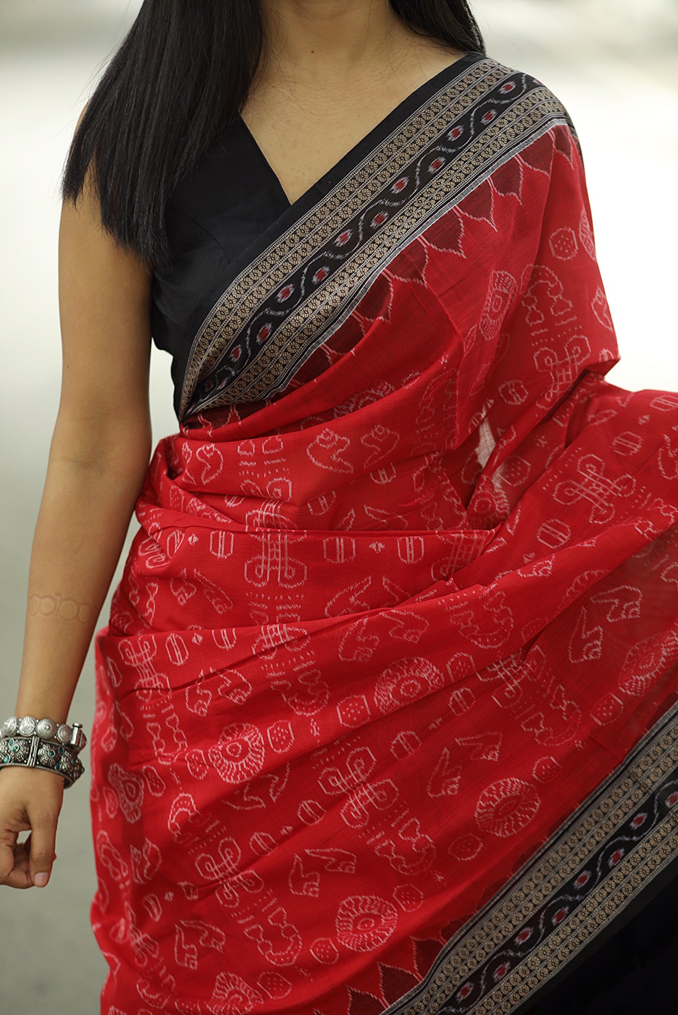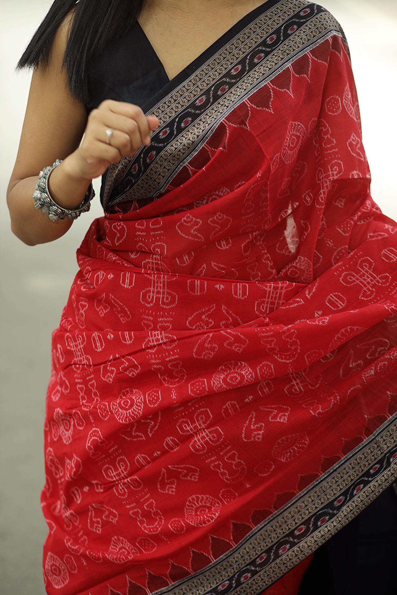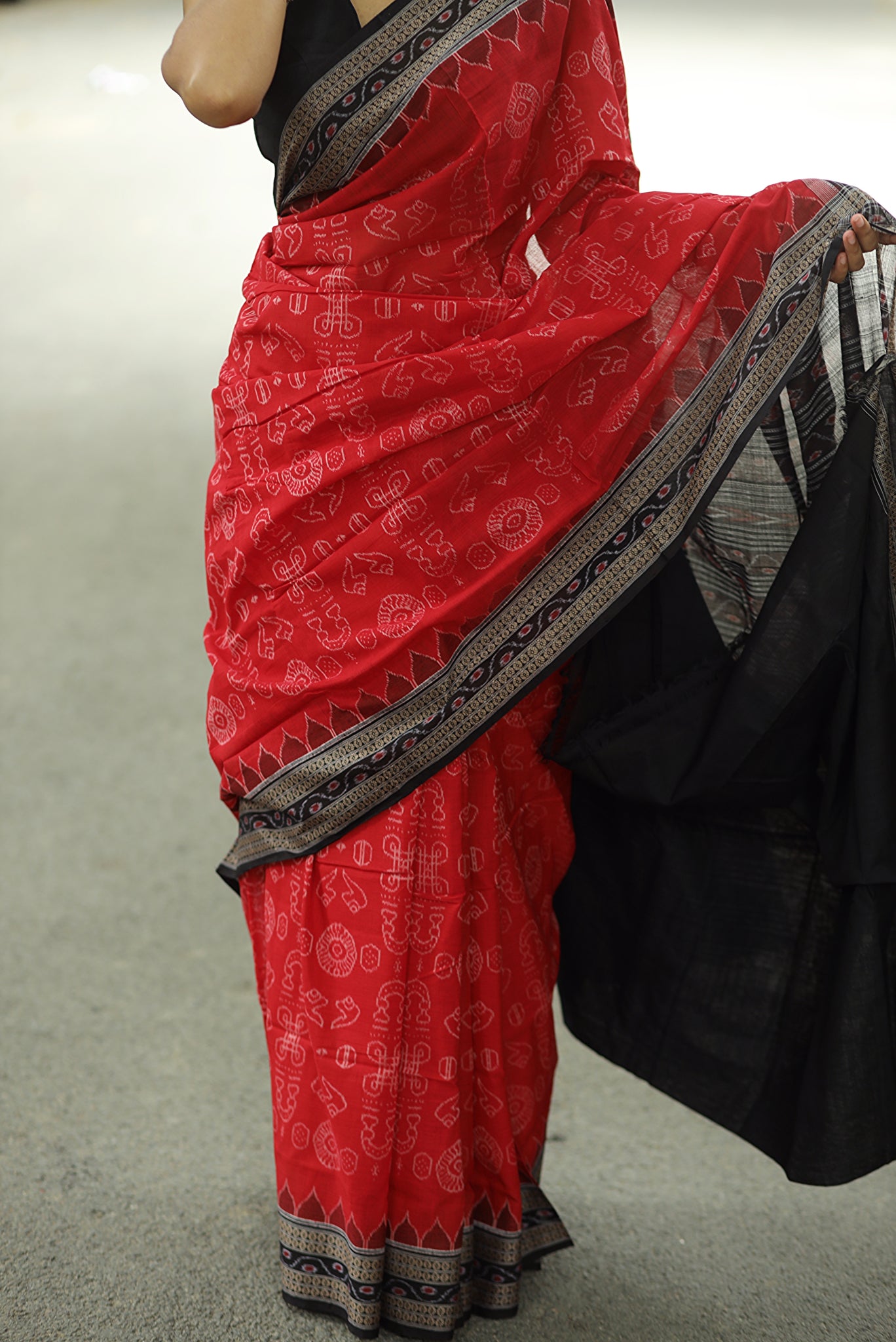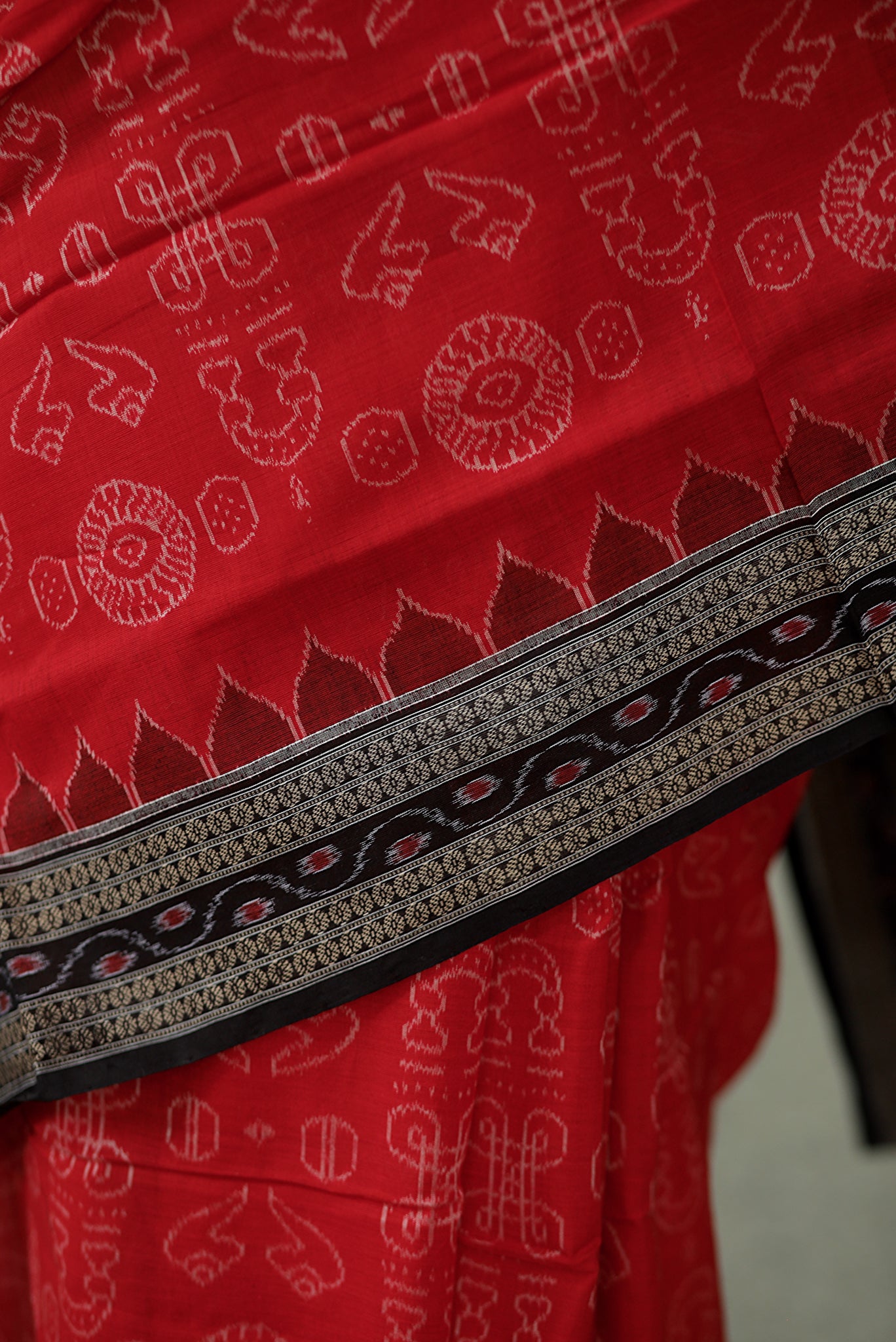 Sacred Red Sambalpuri Cotton Saree - Laxmi Yantra Collection