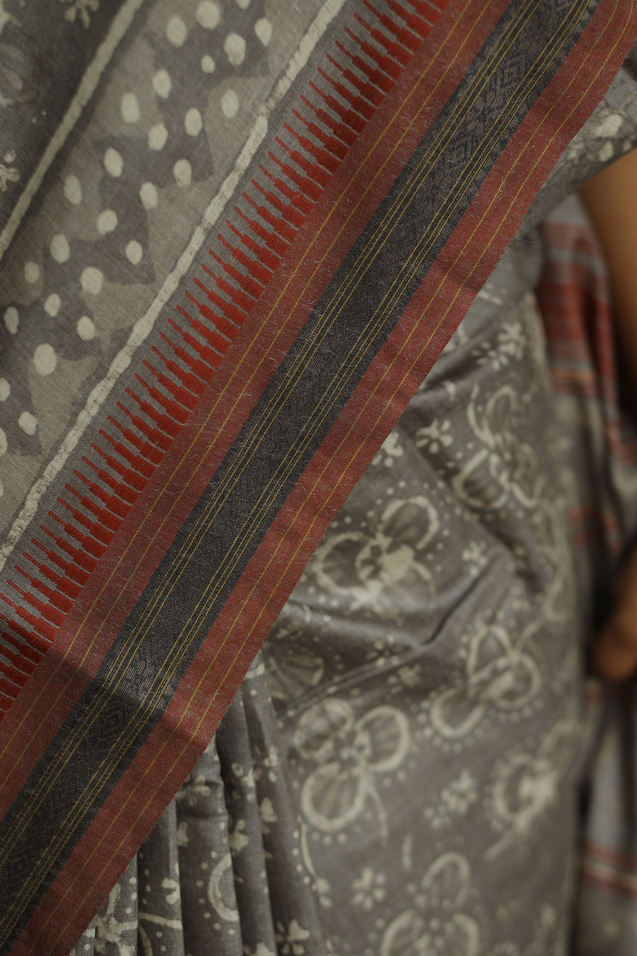 The rich texture of fine Tussar Silk provides a luxurious base for this truly designer Sambalpuri creation. The intricate block prints tell a story of artisan dedication, meticulously applied to create captivating patterns. What truly sets this saree apart is its vibrant Vidarbha border (Karvati Kinar), a traditional weave that adds a striking contrast and depth. While not an Ikat-dyed design, the precision of the block printing and the unique border showcases a different facet of the meticulous handweaving process. The accompanying jala pallu further enhances its elegance, ensuring you make a dignified and enchanting statement wherever you go. Crafted from Gicha Tussar Silk, this saree offers both comfort and durability, making it perfect as a Festive Sambalpuri choice or for any special occasion that calls for luxury Sambalpuri wear.
