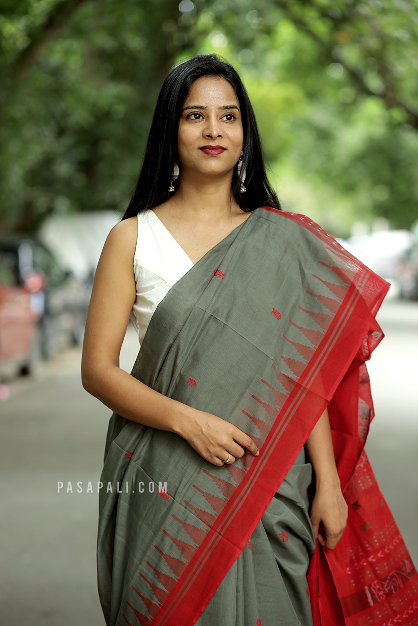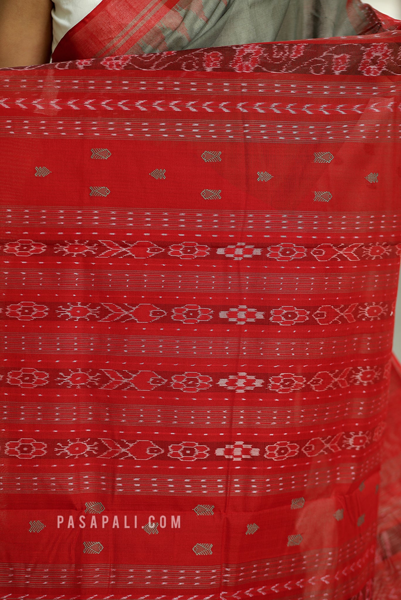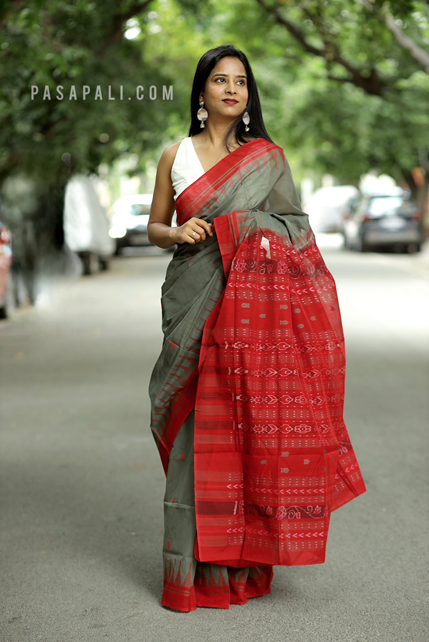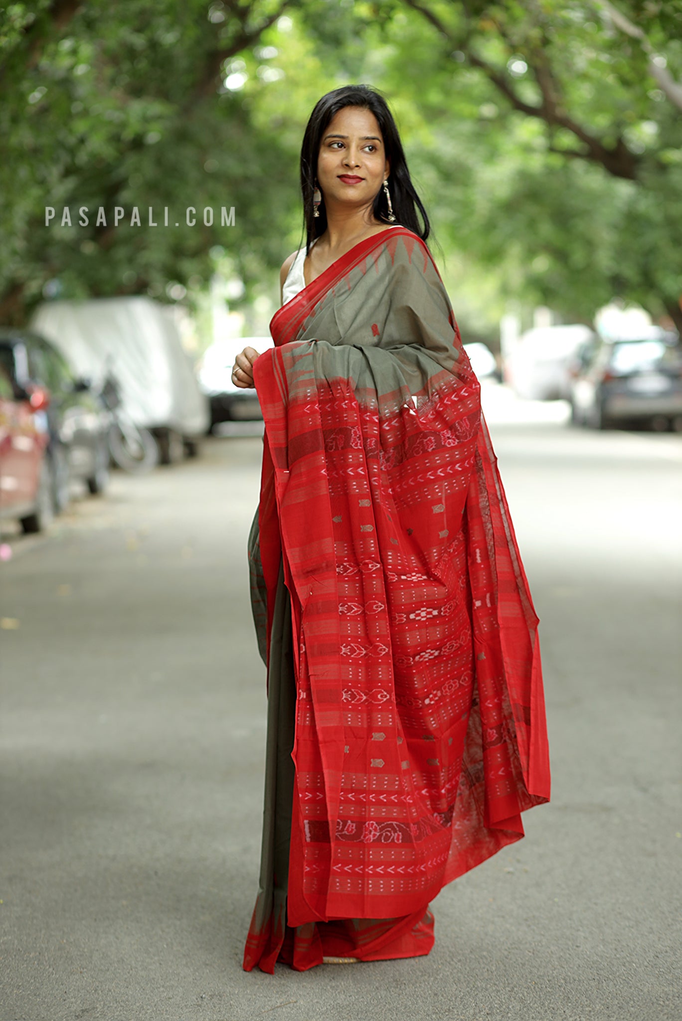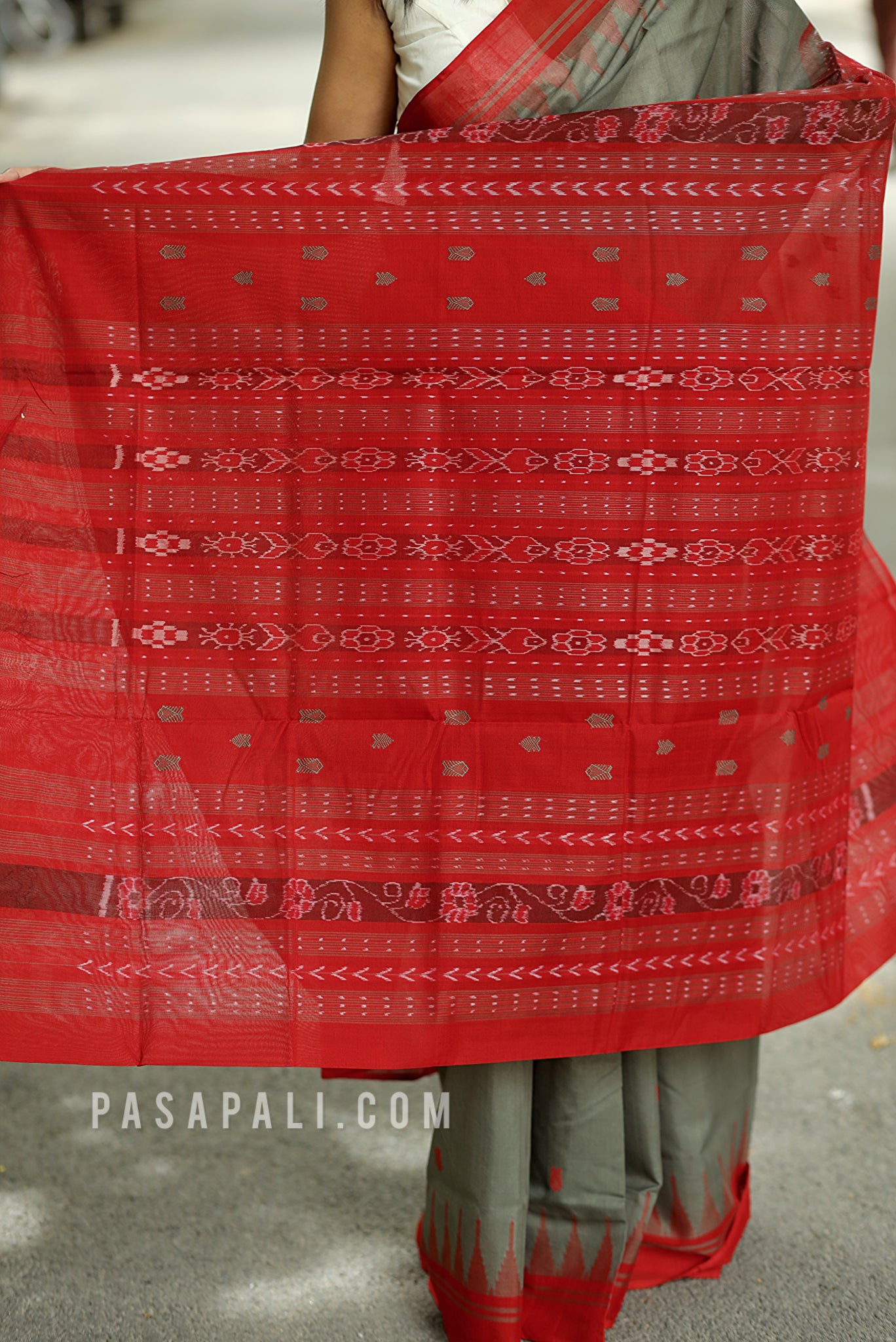 | Product Name | Matsyarekha – Mud Grey Sambalpuri Phoda Kumbha Saree with Red Temple Border |