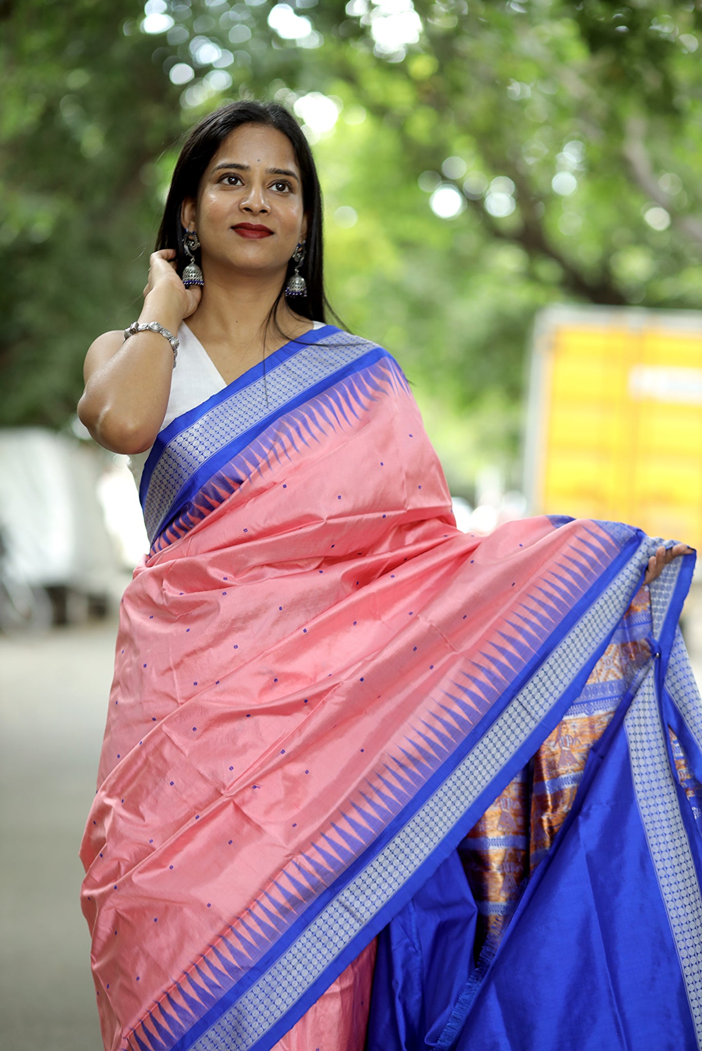 Jewelry: Pair with traditional 22k gold temple jewelry or intricate silver filigree to highlight the Bomkai dancer motifs.