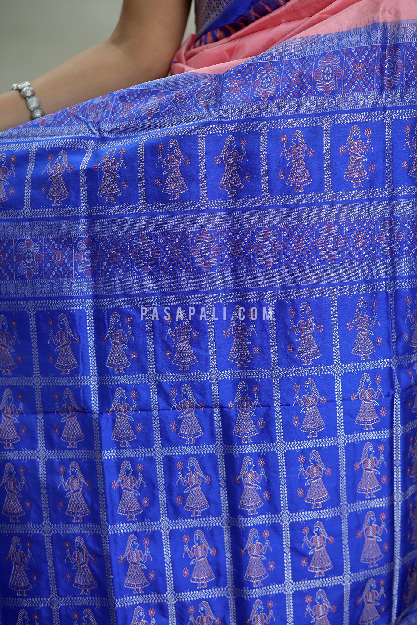 Q: Are the dancer motifs on the pallu printed? A: No. Every Nritya Kanya motif is created using the complex Bomkai Jala technique. Each thread is manually lifted and woven to create the human figures, ensuring the design is part of the fabric’s soul, not just on the surface.