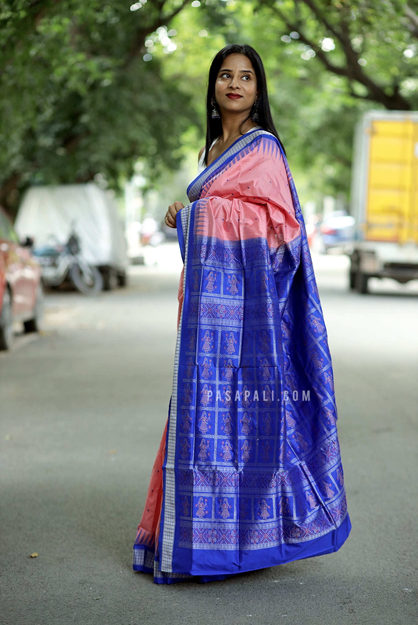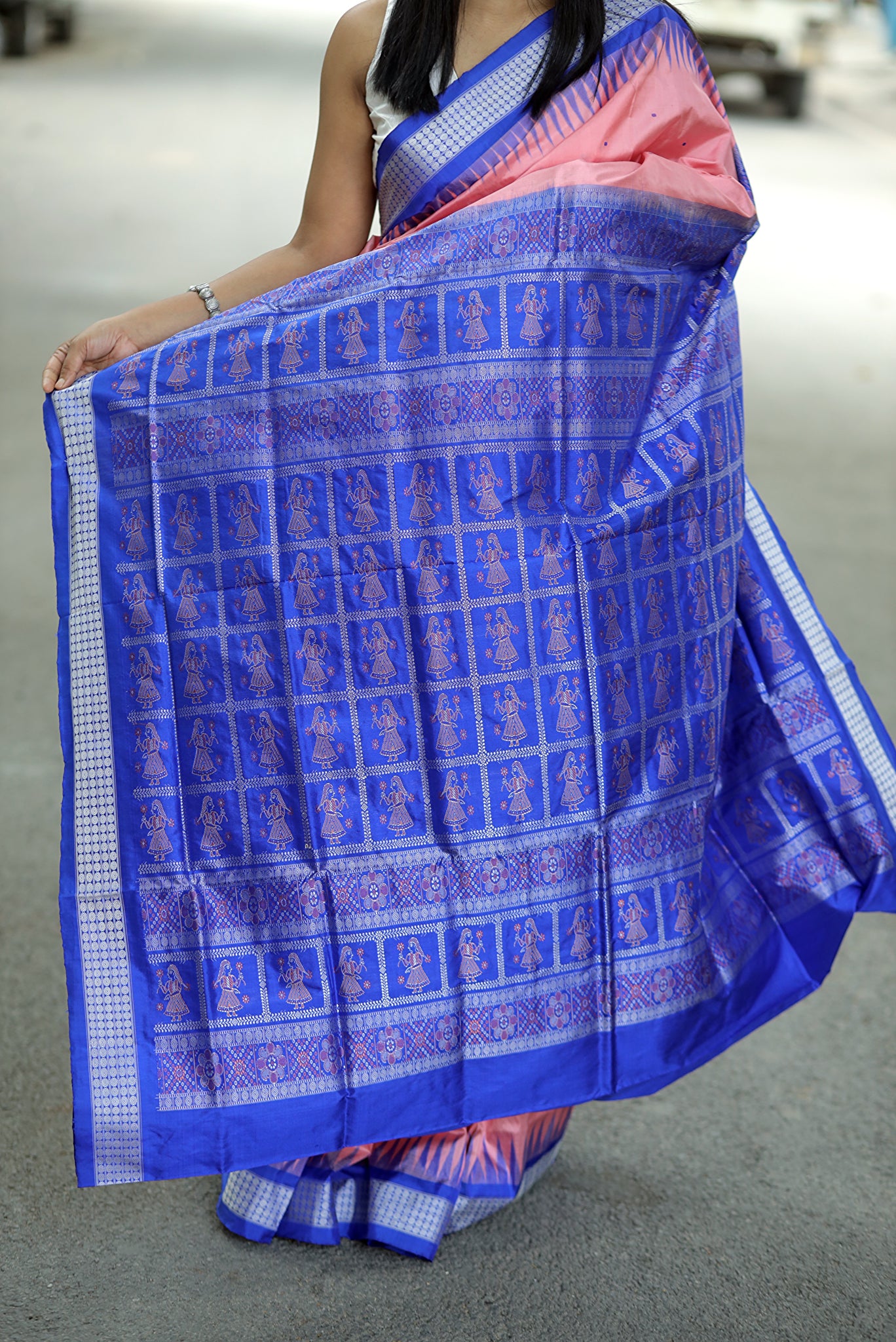Experience the regal drape of pure Mulberry silk, where the rhythmic elegance of traditional Bomkai dancer motifs meets the timeless artistry of Sambalpuri weaving.