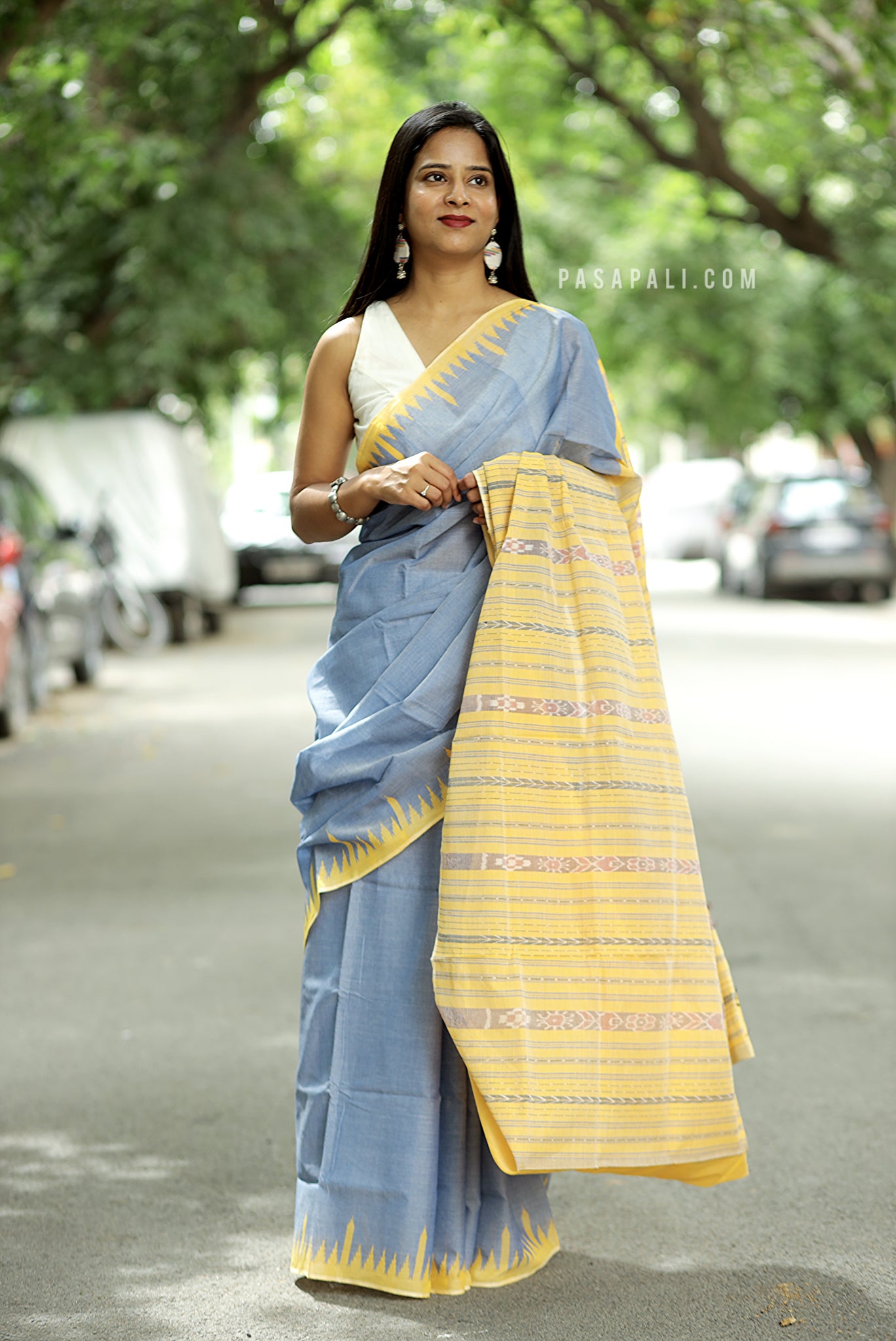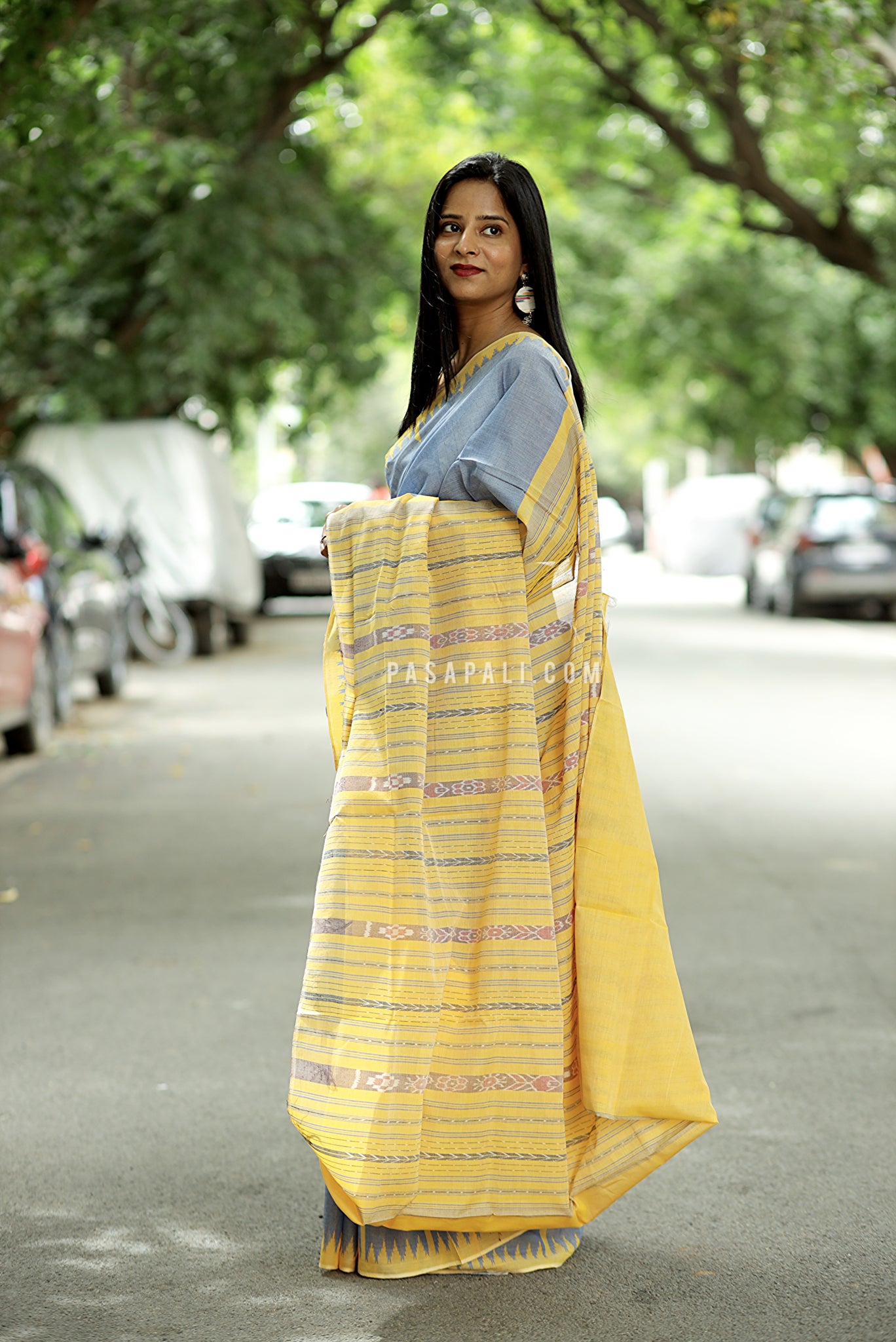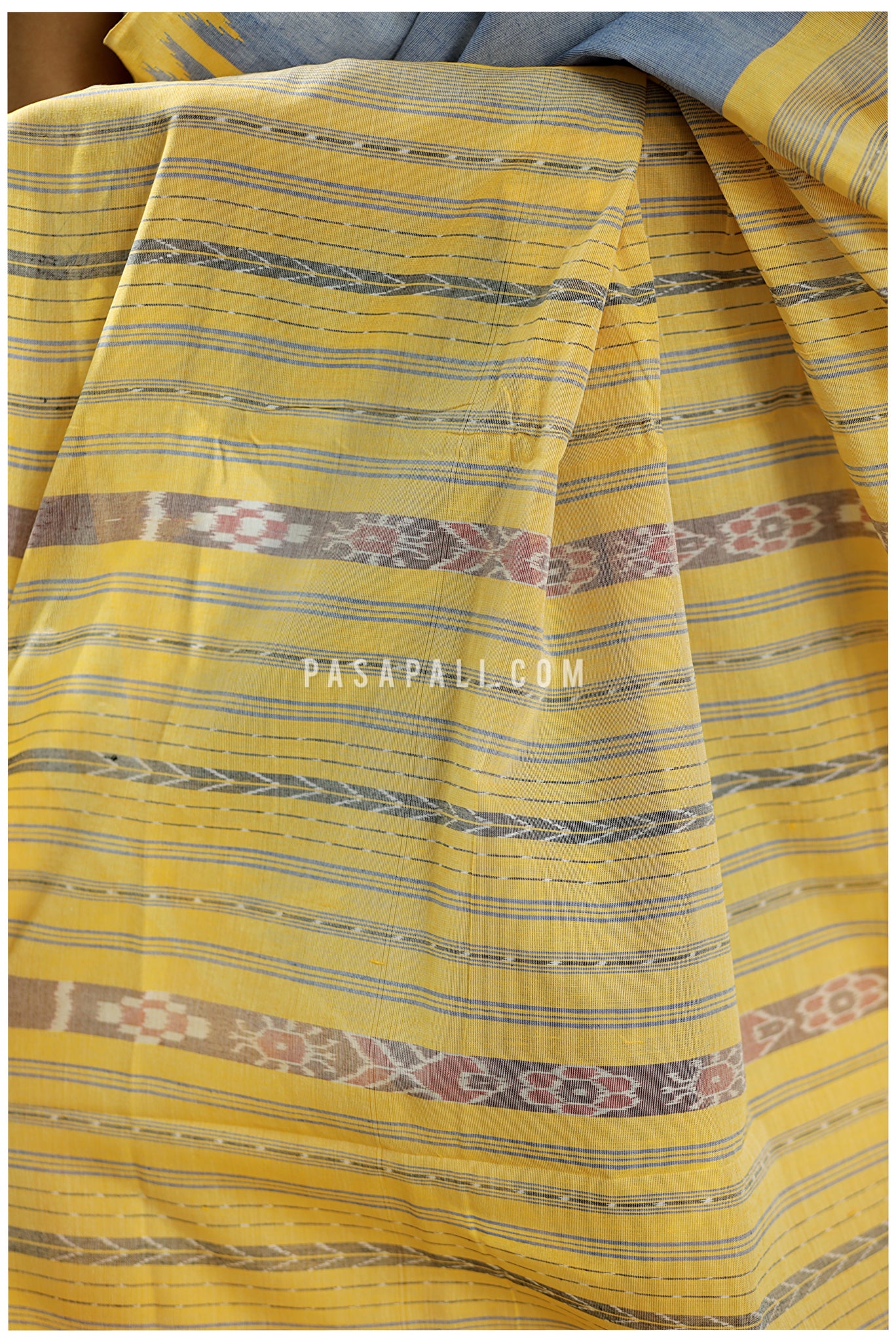 The body of the saree is adorned in soothing pastel blue, beautifully complemented by a pastel yellow border woven with a mix of small and medium temple motifs, symbolizing divinity and grace. Its ikat pallu, featuring delicate fish motifs and rhythmic stripes, celebrates the fluidity of nature and traditional artistry of the Sambalpur region.