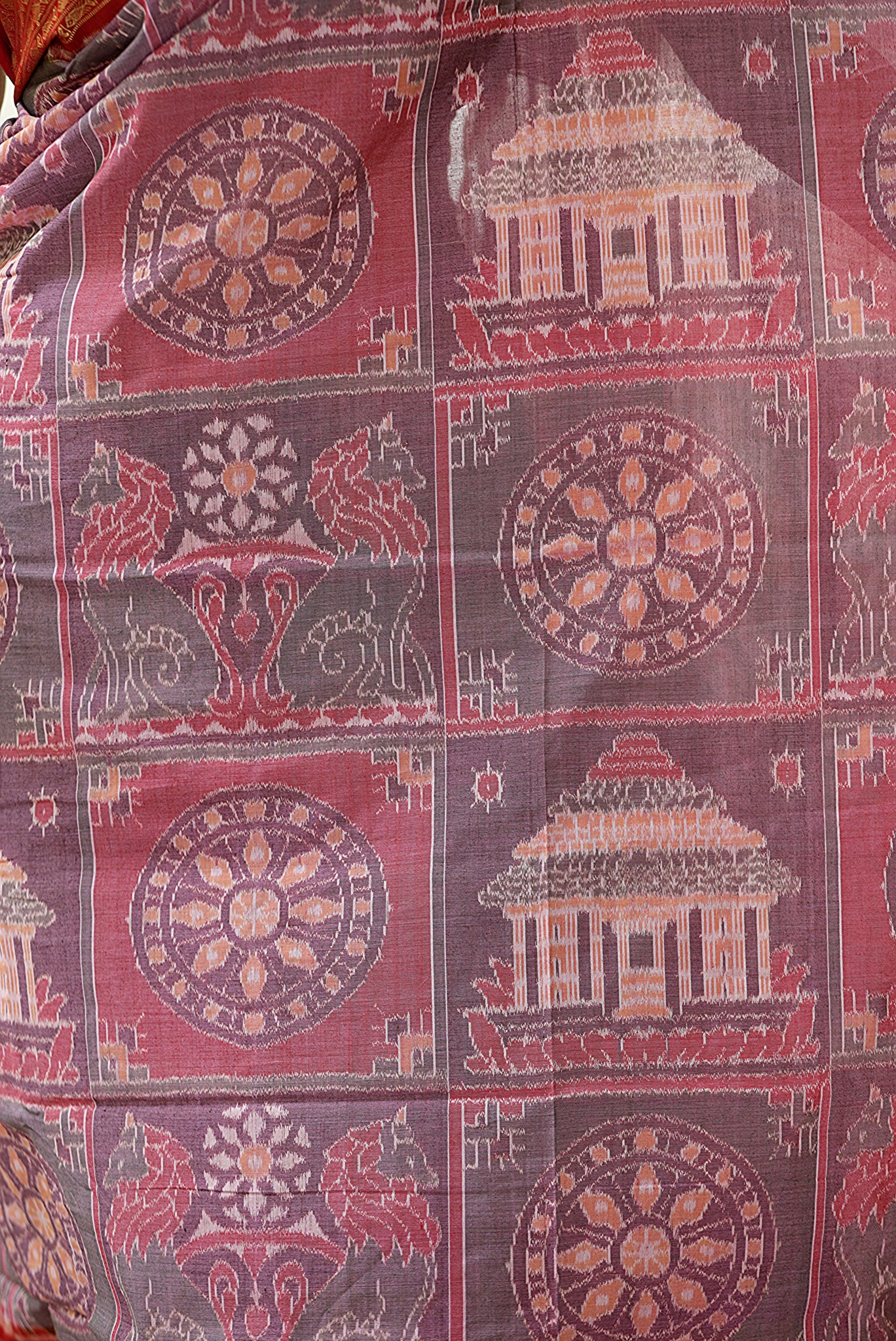 The soft baby pink body is adorned with intricately woven Konark temple structures, the iconic Konark chakra, and symbolic motifs of the lion and elephant, each representing power, protection, and divine energy. These motifs, inspired directly from the carvings of the Sun Temple, make this saree a wearable piece of history.