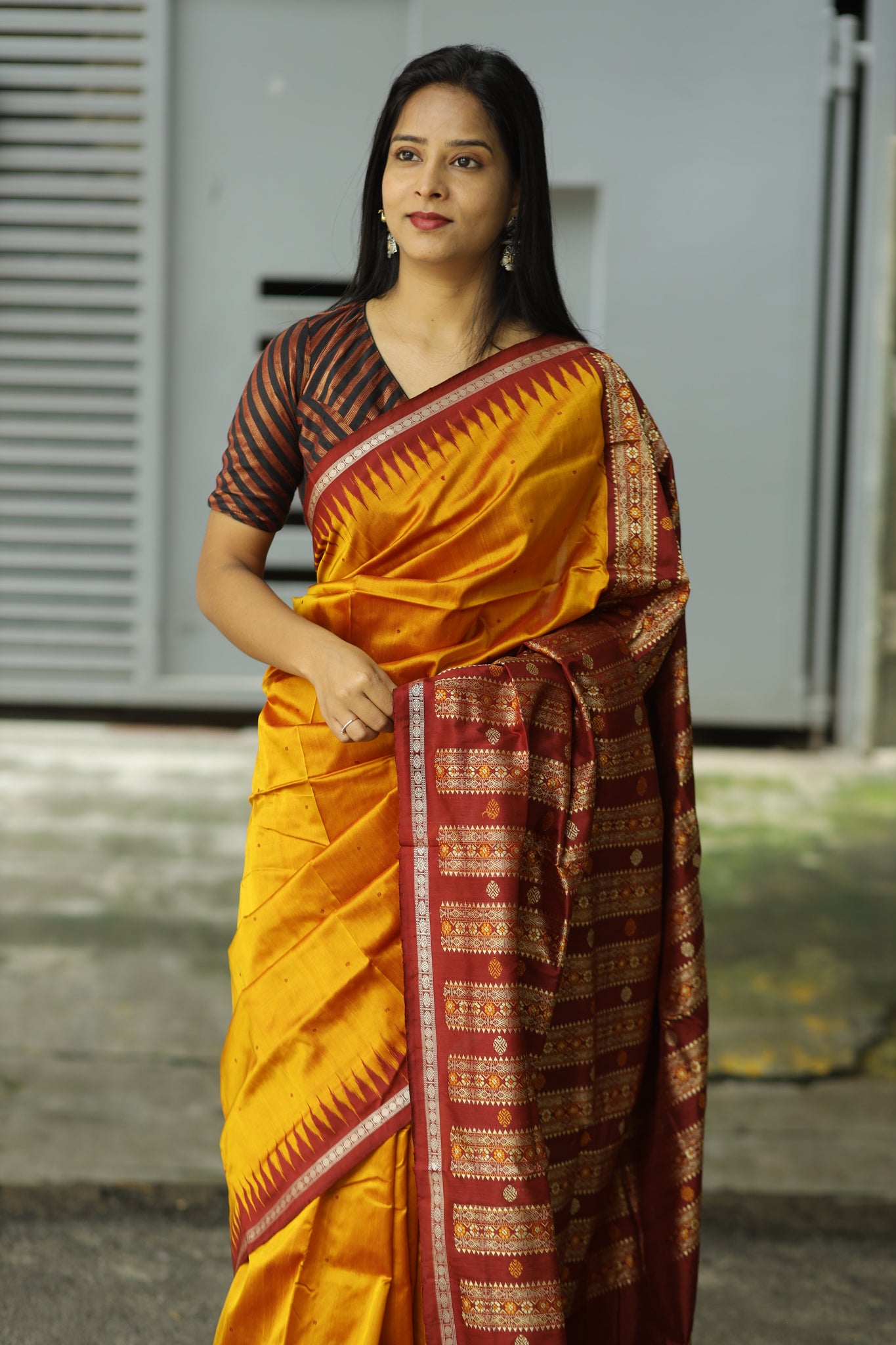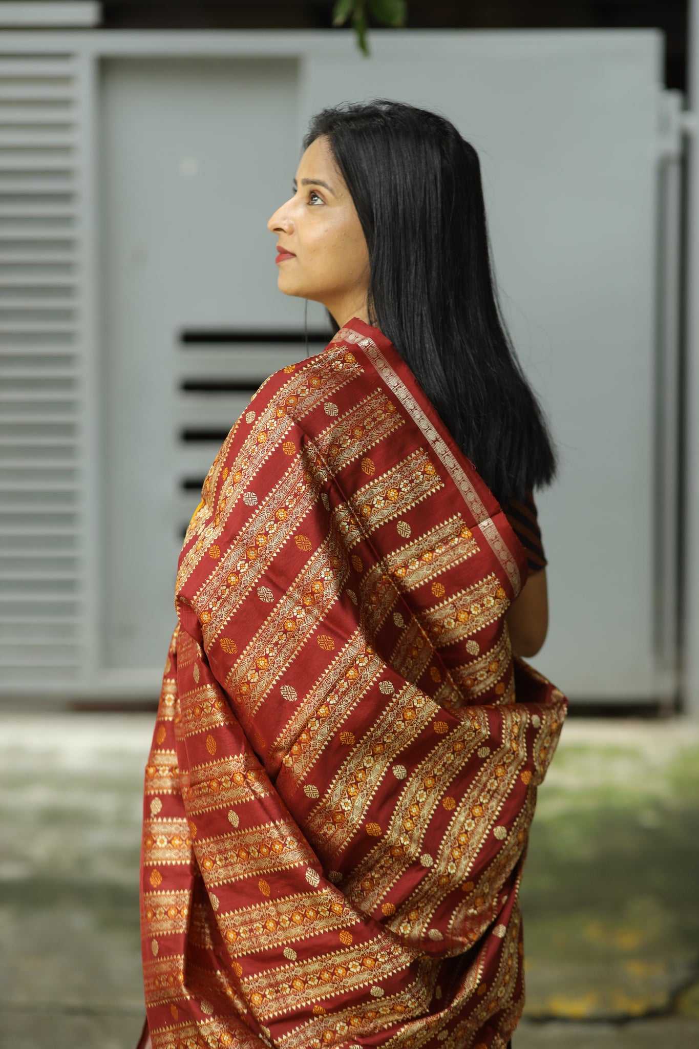 Border: Maroon border woven with Ekfulia Rudraksha motifs symbolizing spirituality and tradition
