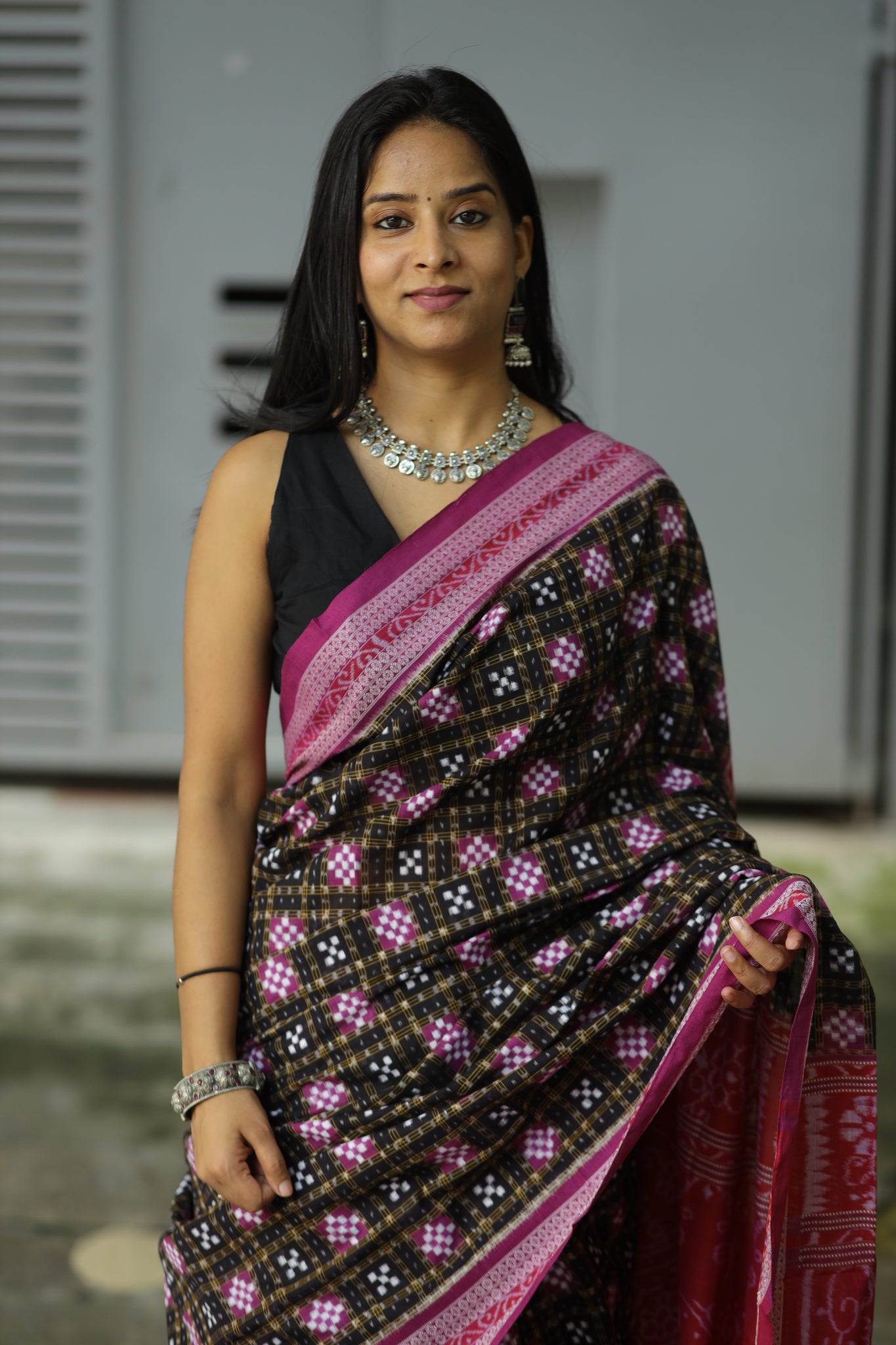 Indulge in the timeless elegance of our Pasapalli Cotton Saree, meticulously handcrafted to perfection. Featuring a mesmerizing mini pasapalli design adorning the body, this saree is a celebration of traditional Odisha weaving techniques. The striking purple border adds a touch of sophistication, complemented by a gorgeous pink ikat pallu that exudes charm and grace.