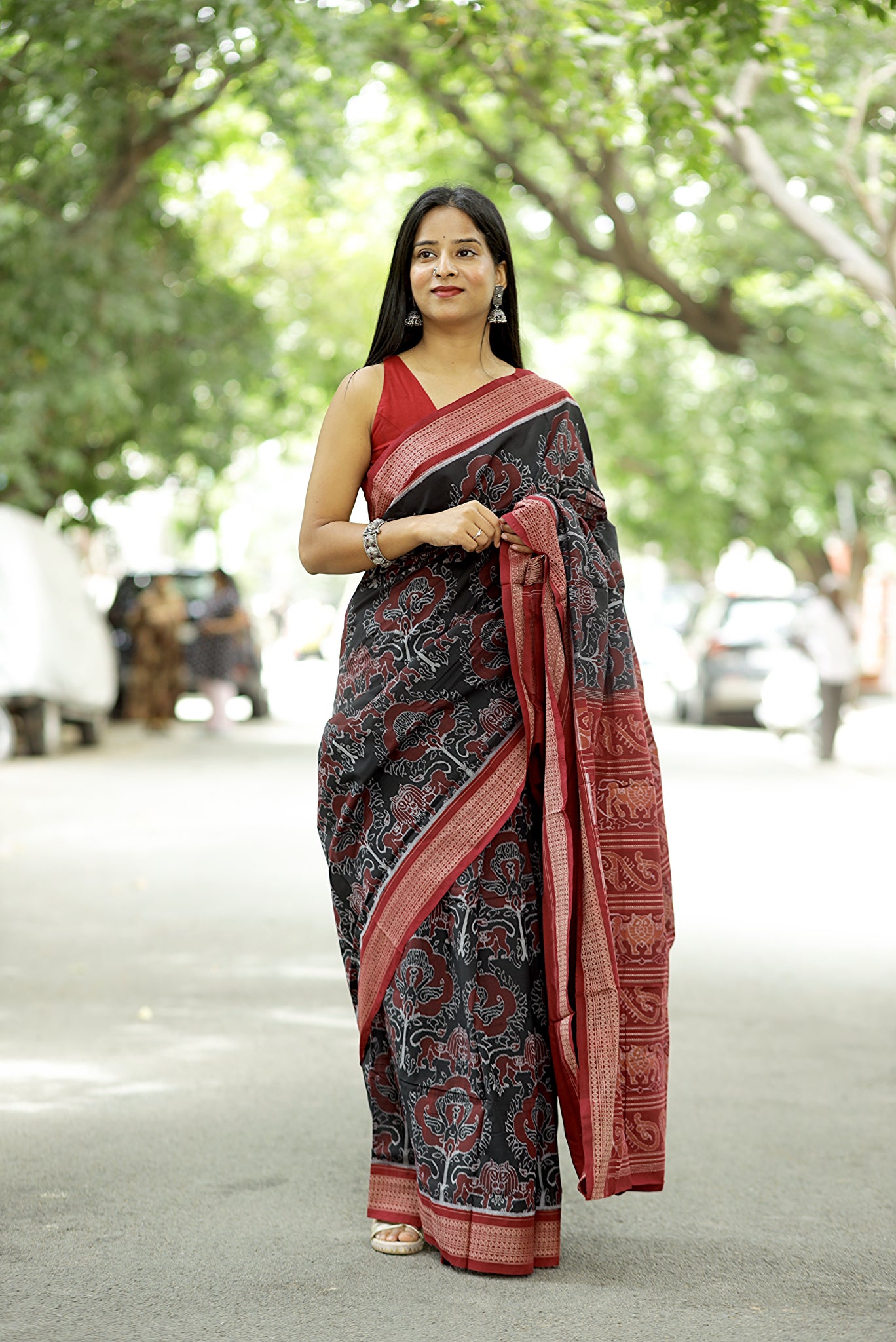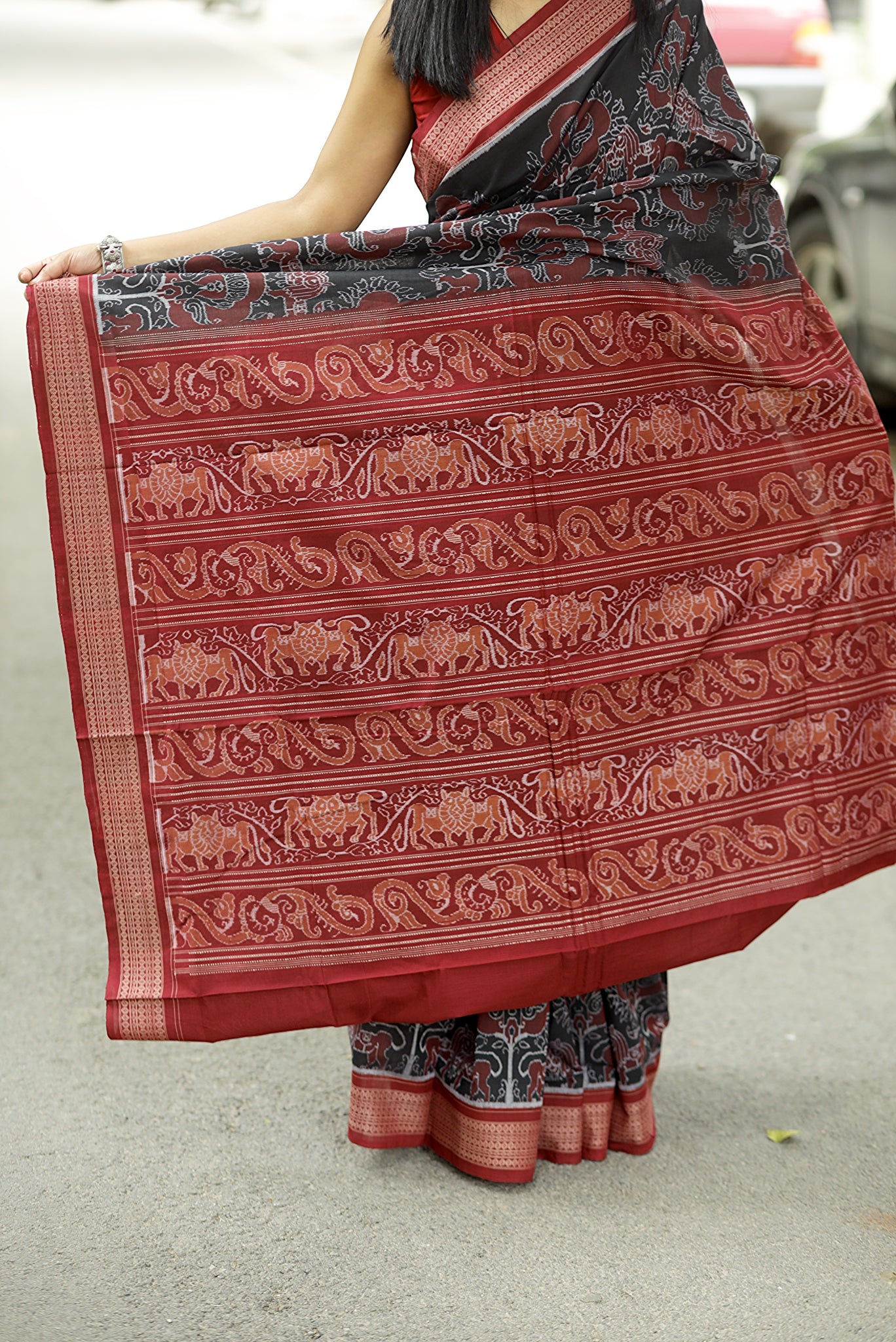 The deep black body forms the perfect canvas for meticulously woven Kalpavriksha and Simha motifs, each crafted through the intricate Bandha (Ikat) tie-and-dye technique, where threads are pre-dyed before weaving. This laborious process requires unmatched skill, precision, and artistic intuition—hallmarks of authentic handloom Sambalpuri saree craftsmanship.
