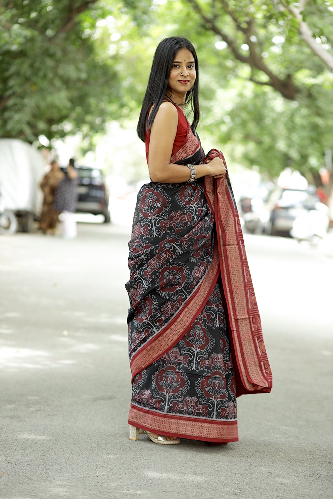 Unveil the power of heritage with Pasapali’s Shyama-Simha Kalpavriksha Sambalpuri Saree, an extraordinary expression of Odisha’s legendary Ikat artistry. Handwoven in premium mercerized cotton, this masterpiece brings together two of the most auspicious motifs in Indian textile culture—the Kalpavriksha (Tree of Life) and the Simha (lion), symbolising strength, abundance, and divine protection.