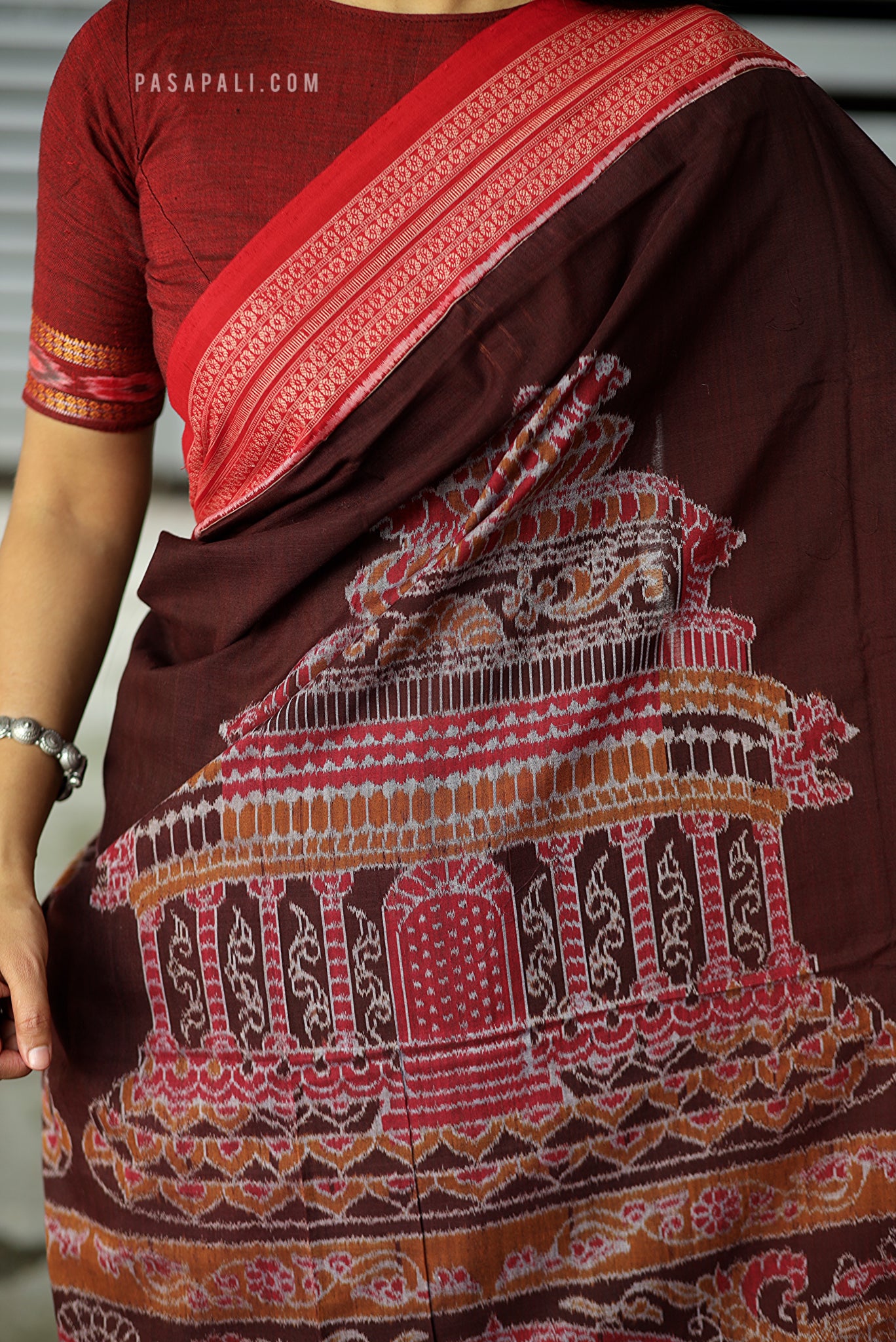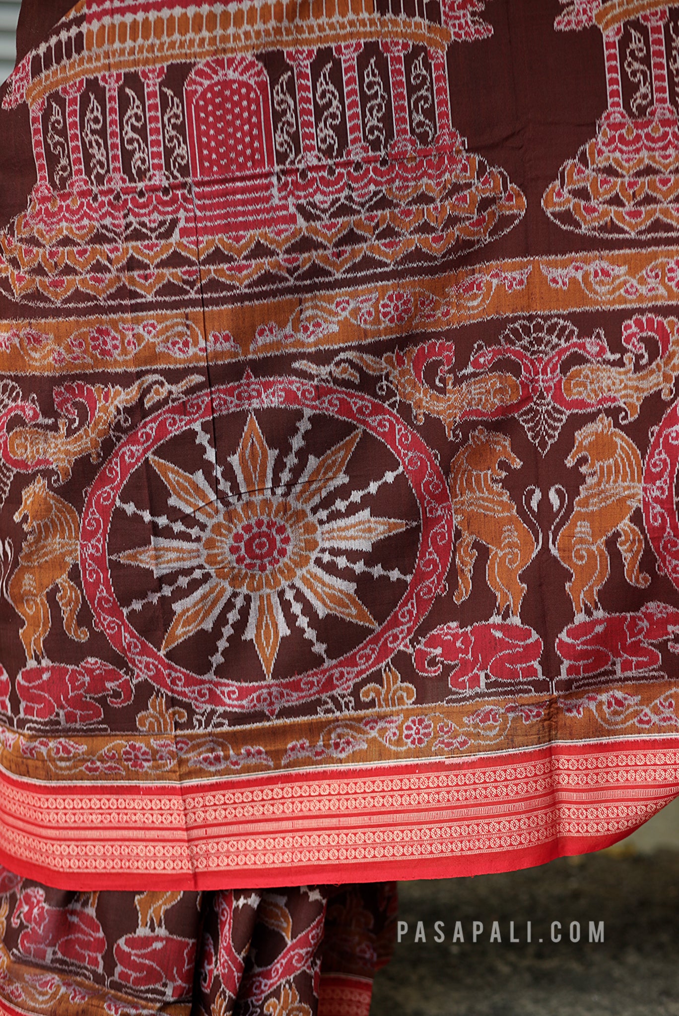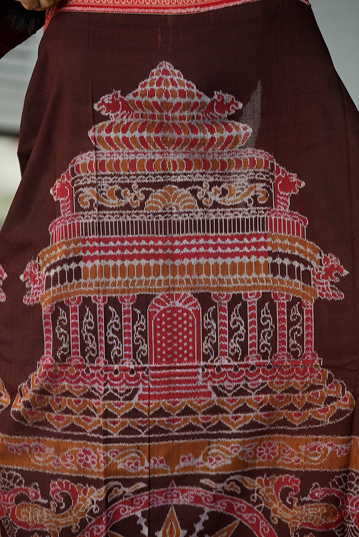 The deep dark brown body carries intricately woven motifs of the Konark temple structures, the Konark chakra (Sun Wheel), the majestic lion and elephant, and the graceful mayur (peacock)—each symbol deeply rooted in the history and artistic marvels of the Sun Temple. These motifs celebrate strength, divinity, and eternal movement, making this saree a true heritage collectible.