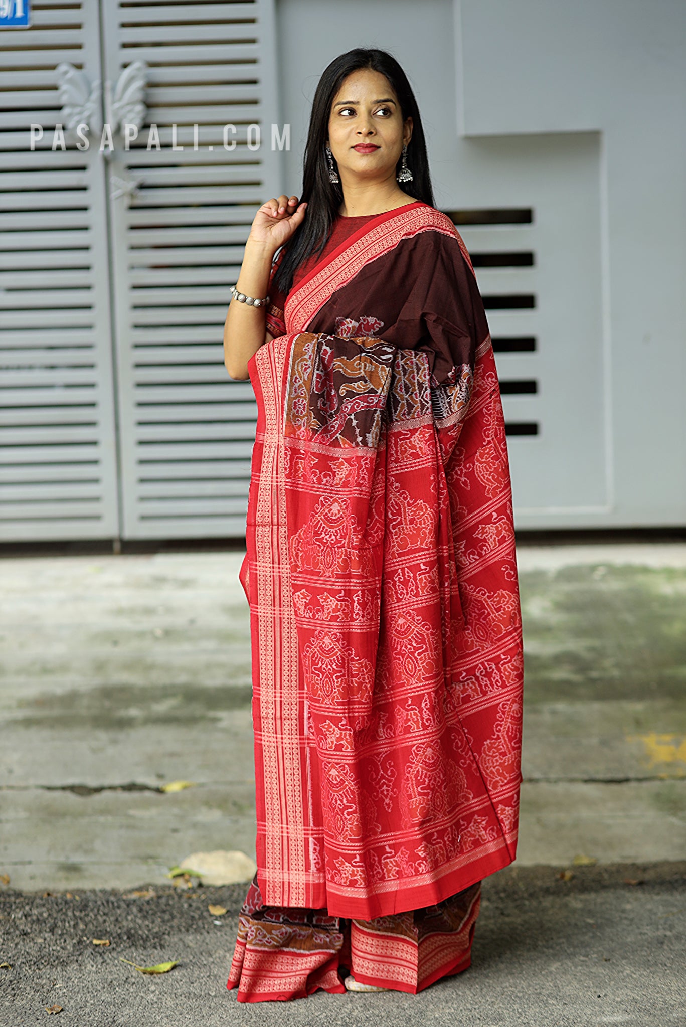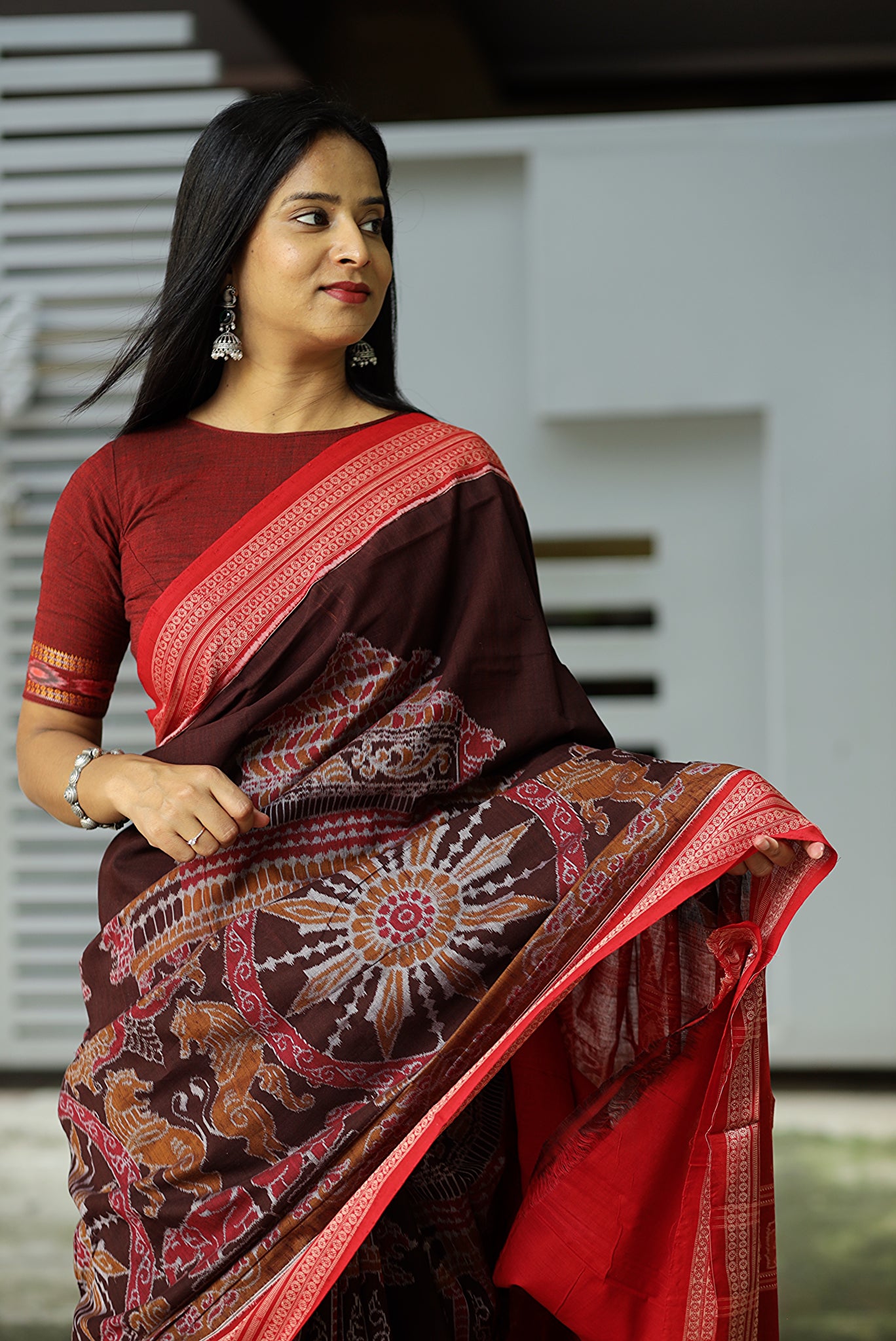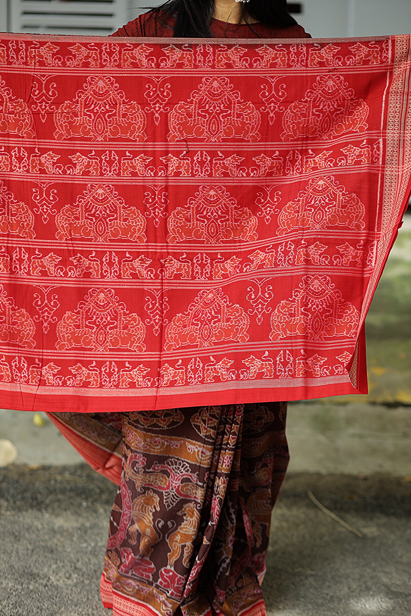 The deep dark brown body carries intricately woven motifs of the Konark temple structures, the Konark chakra (Sun Wheel), the majestic lion and elephant, and the graceful mayur (peacock)—each symbol deeply rooted in the history and artistic marvels of the Sun Temple. These motifs celebrate strength, divinity, and eternal movement, making this saree a true heritage collectible.