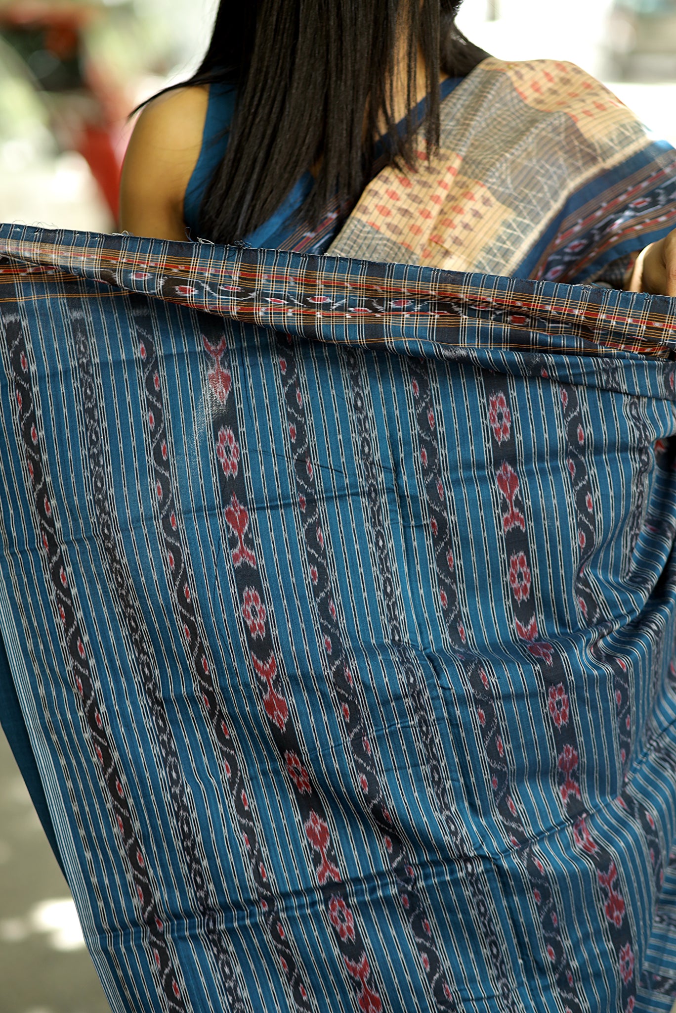 Celebrate the soulful charm of Odisha’s weaving legacy with this teal blue and cream Sambalpuri cotton saree, intricately crafted using the traditional Bandha (Ikat) technique. Made by skilled weavers from the culturally rich clusters of Western Odisha, this saree reflects the timeless beauty of heritage motifs and fine handloom artistry.