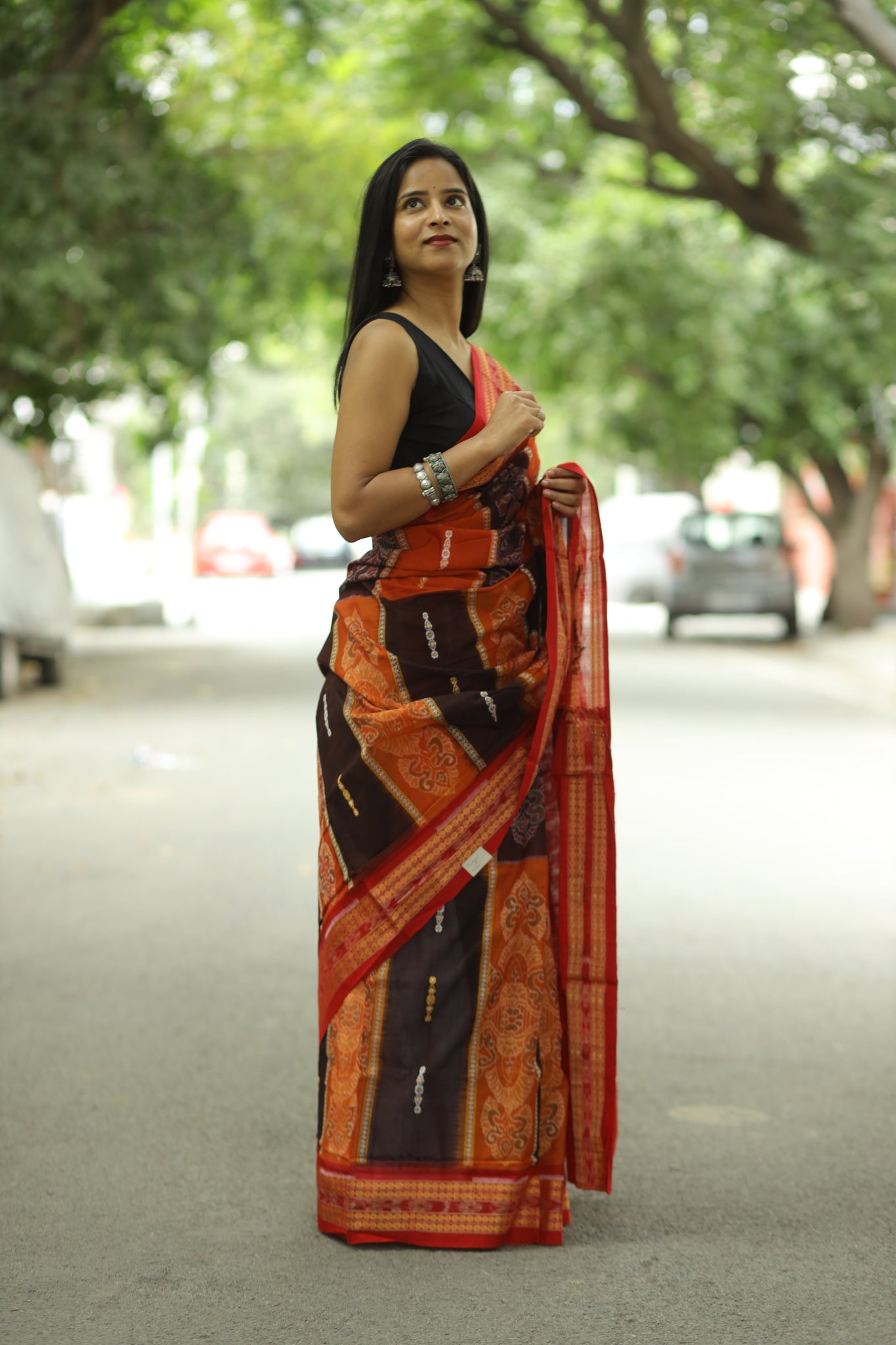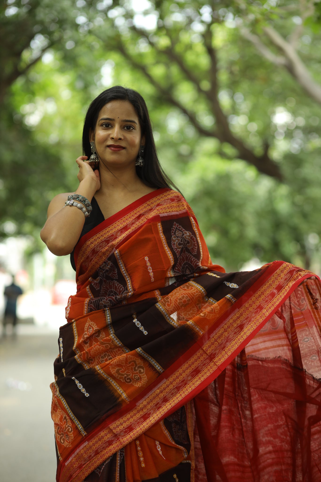 Elevate your style with an enchanting Sambalpuri saree from Pasapali. This exquisite Sambalpuri cotton saree boasts stunning floral ikat motifs across the body in striking orange and black hues. The saree's pièce de résistance is its captivating red ikat pallu, exuding timeless elegance. Explore our collection and embrace the allure of traditional Indian craftsmanship with Sambalpuri cotton sarees, a must-have for any saree connoisseur.