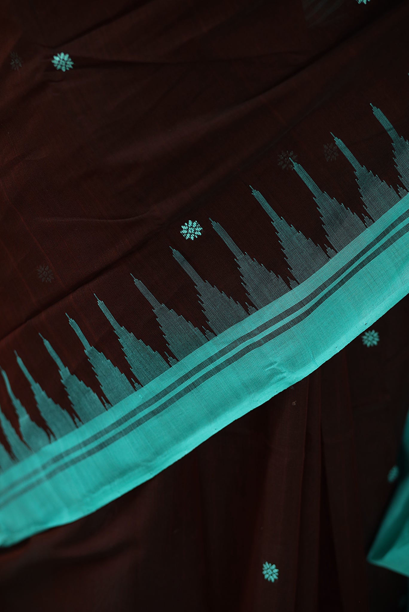 Introducing Teal Tara, a stunning dark brown Sambalpuri Phoda Kumbha cotton saree woven with exquisite finesse by master weavers of Odisha. This handcrafted beauty brings together the timeless charm of traditional Ikat, the precision of Bandha weaving, and the iconic Phoda Kumbha temple border that symbolizes strength and heritage.