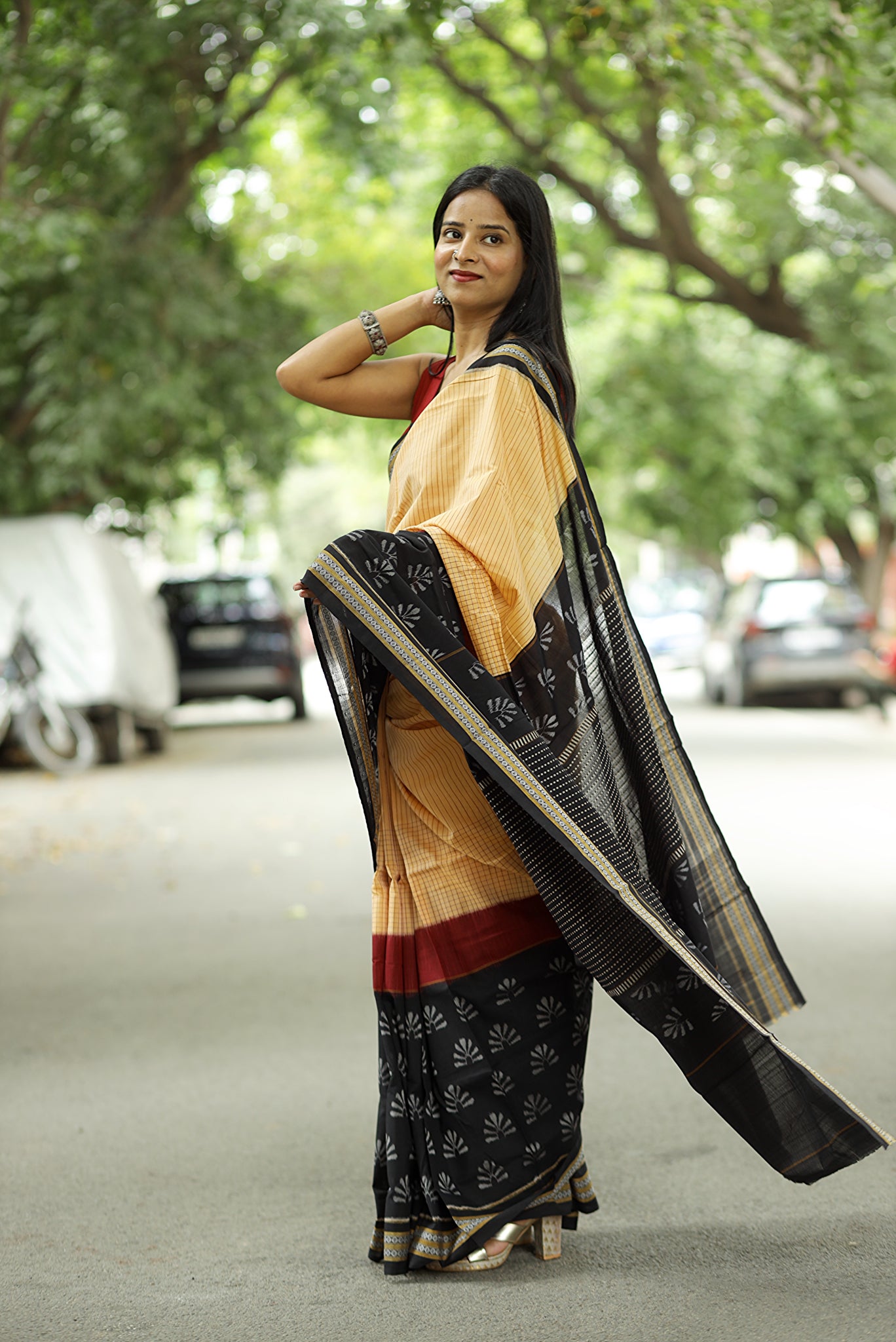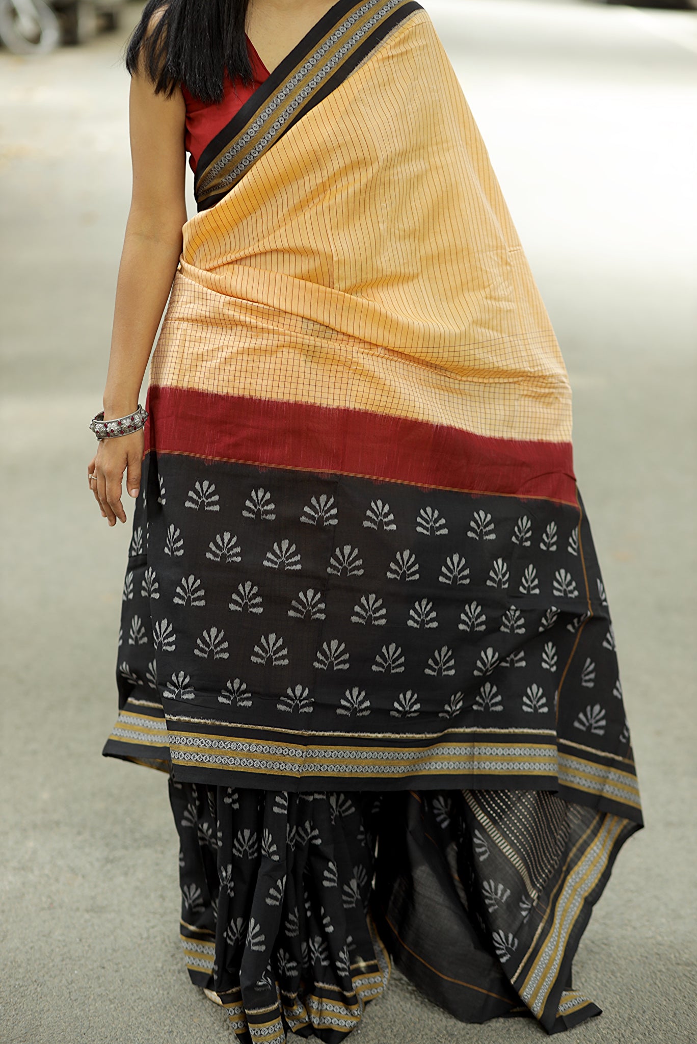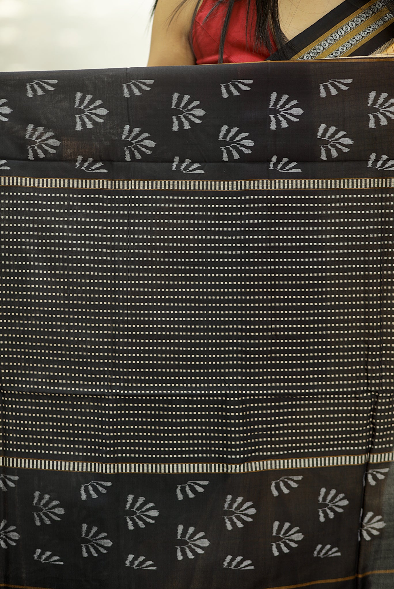 | Key Craftsmanship | Ikat Phula Butta Motif on black panel, striped beige body, simple striped pallu |
