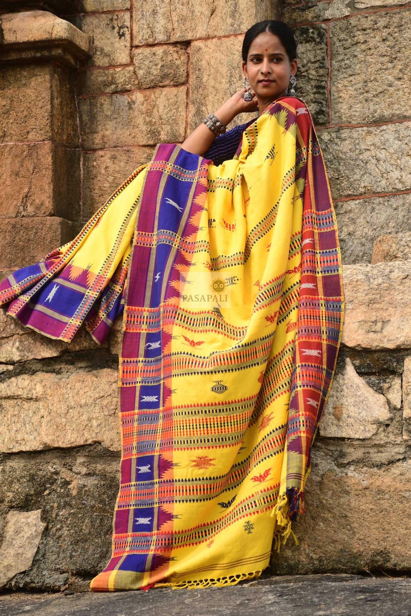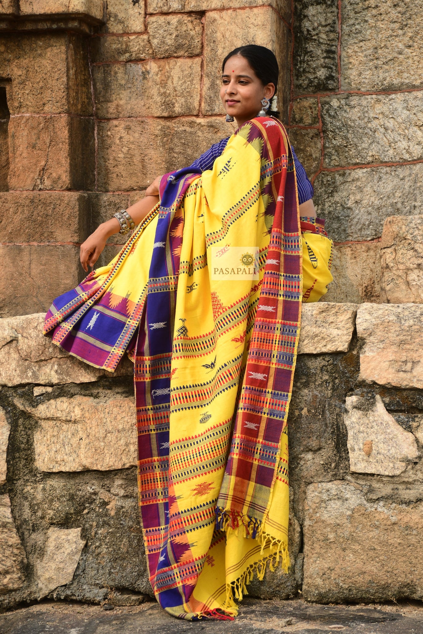 The vibrant yellow body of this saree is a tribute to the sun, achieved through the application of Turmeric (Haldi), while the striking borders are dyed with Aal root (Indian Madder) for the deep reds and Natural Indigo for the cooling blues.