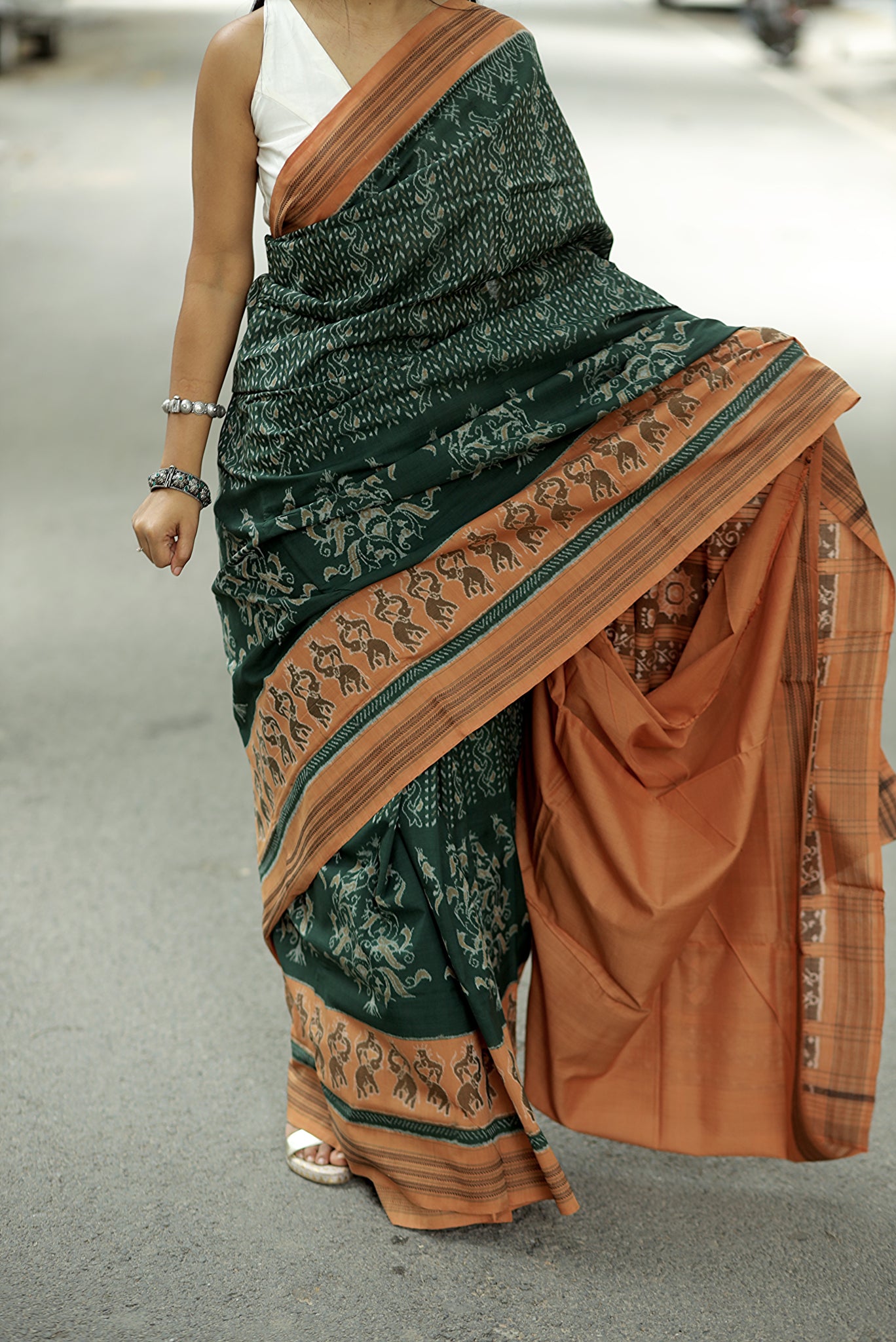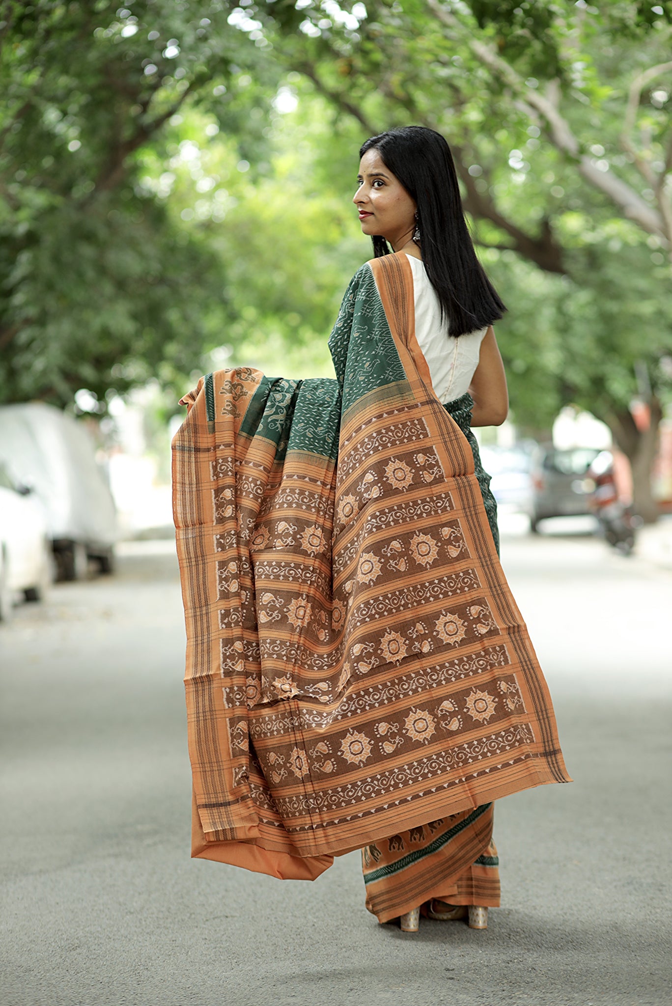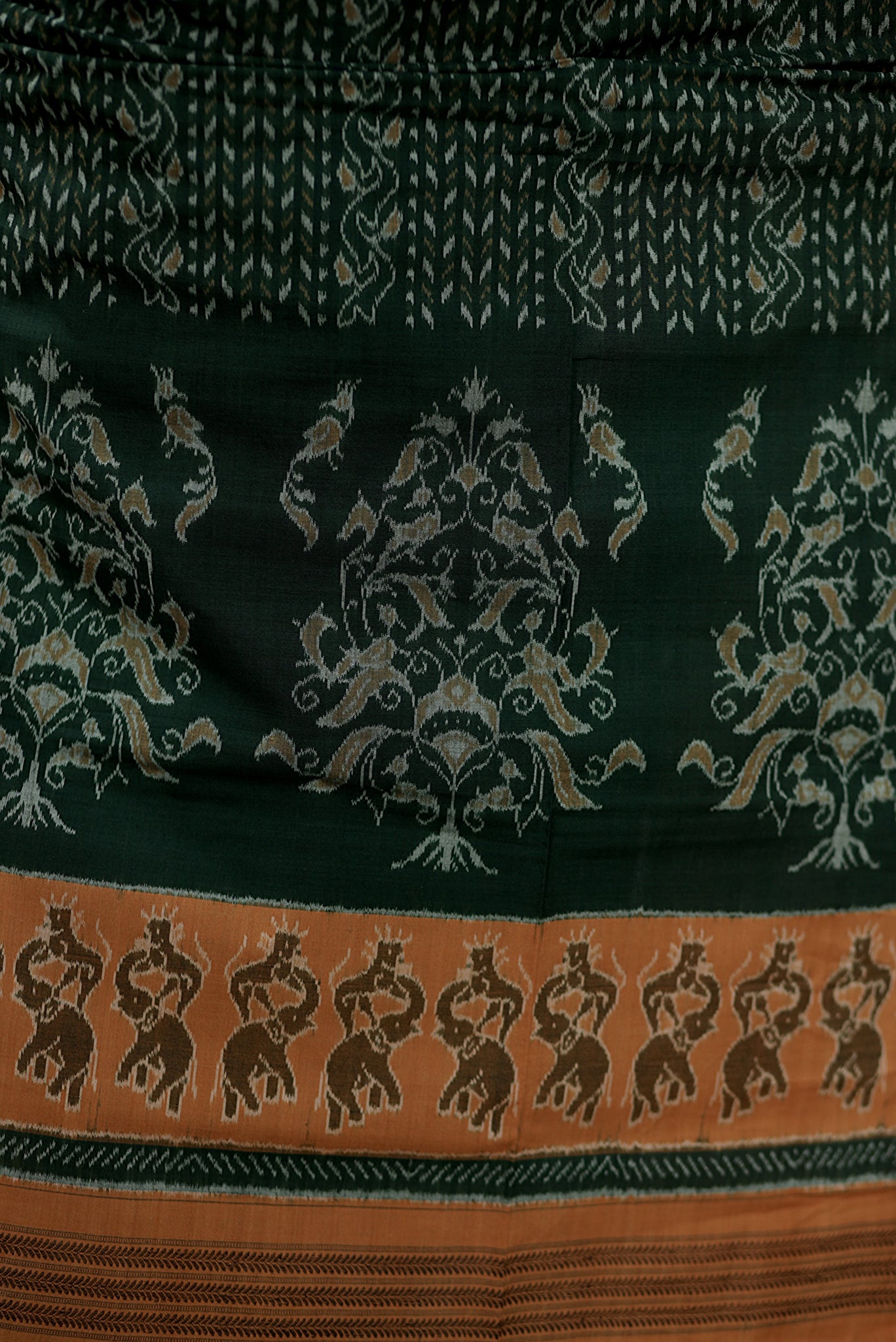 The body comes in a deep, elegant dark green—calm, earthy, and effortlessly graceful. The lower border features the iconic Phula Jala pattern, representing blooming flowers, alongside the traditional Gaja Bandha motif, symbolizing strength, royalty, and auspiciousness in Odisha’s textile tradition. The light brown border beautifully complements the body, creating a warm, balanced contrast.