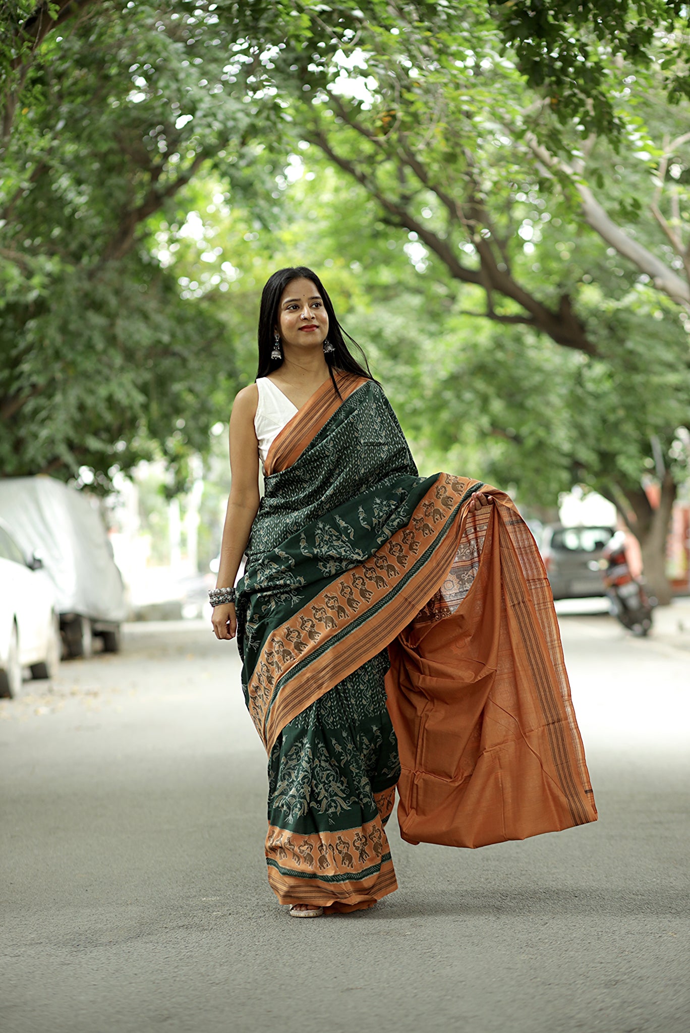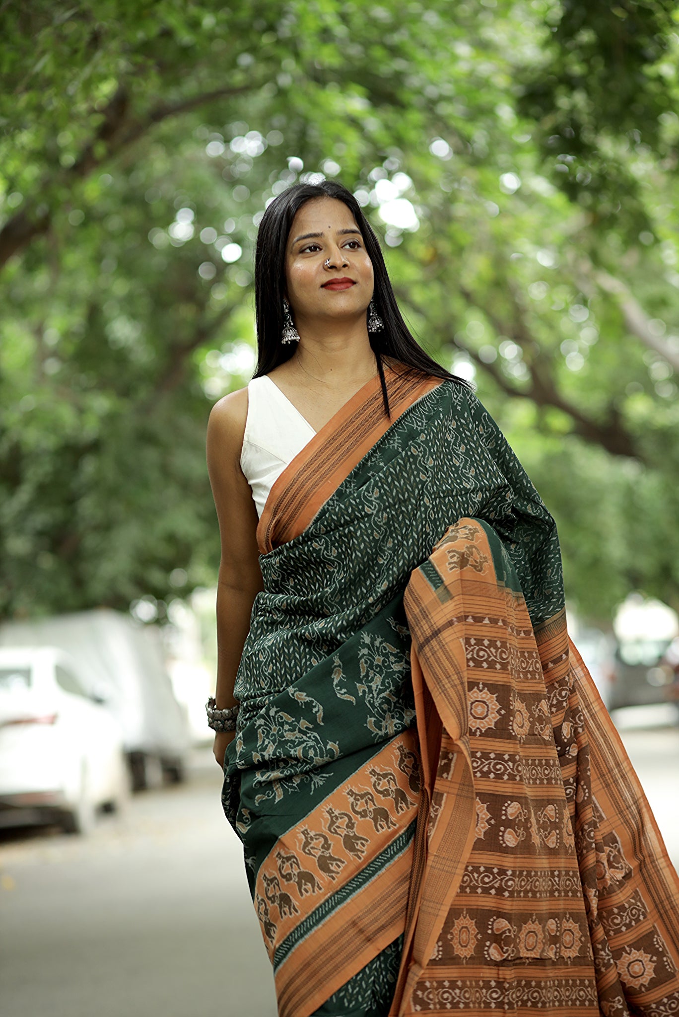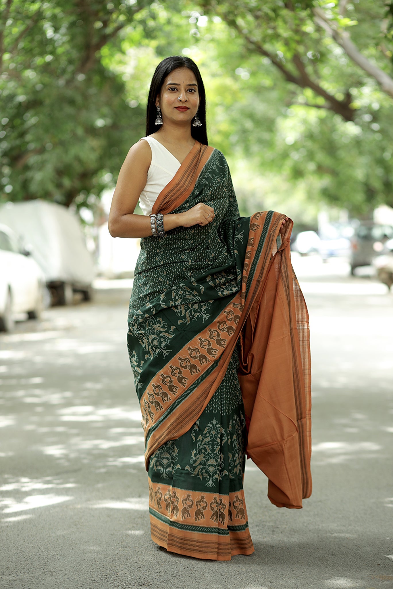 The body comes in a deep, elegant dark green—calm, earthy, and effortlessly graceful. The lower border features the iconic Phula Jala pattern, representing blooming flowers, alongside the traditional Gaja Bandha motif, symbolizing strength, royalty, and auspiciousness in Odisha’s textile tradition. The light brown border beautifully complements the body, creating a warm, balanced contrast.